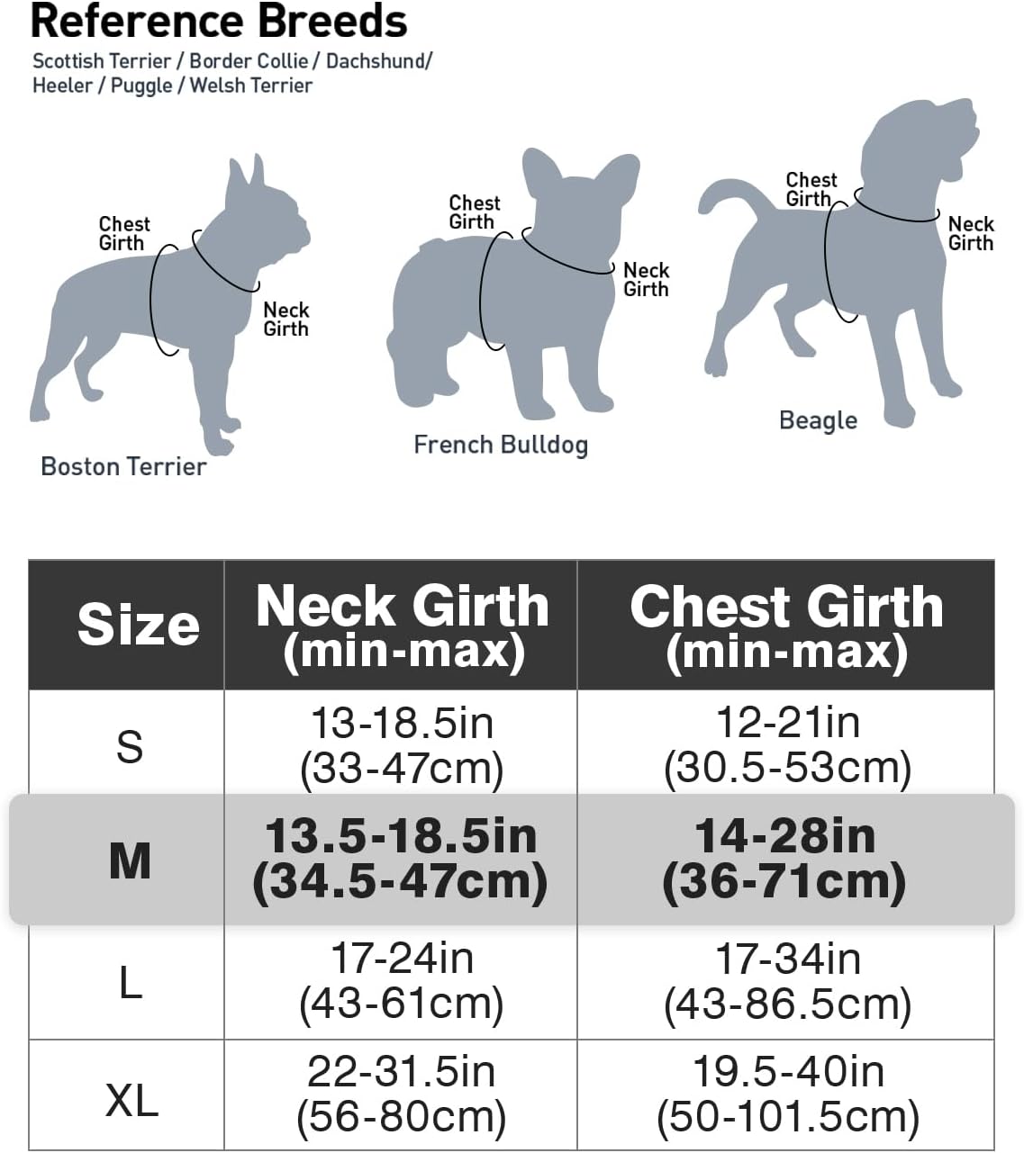 RECOMMENDED BREEDS – Medium size dogs – Chest Girth: 14″-28″ / Neck Girth: 13.5″-18.5″, such as French Bulldog, Beagle, Boston Terrier, Scottish Terrier, Border Collie, Dachshund, Heeler. You can purchase it with the joytale leash for a better experience for you and your dog!