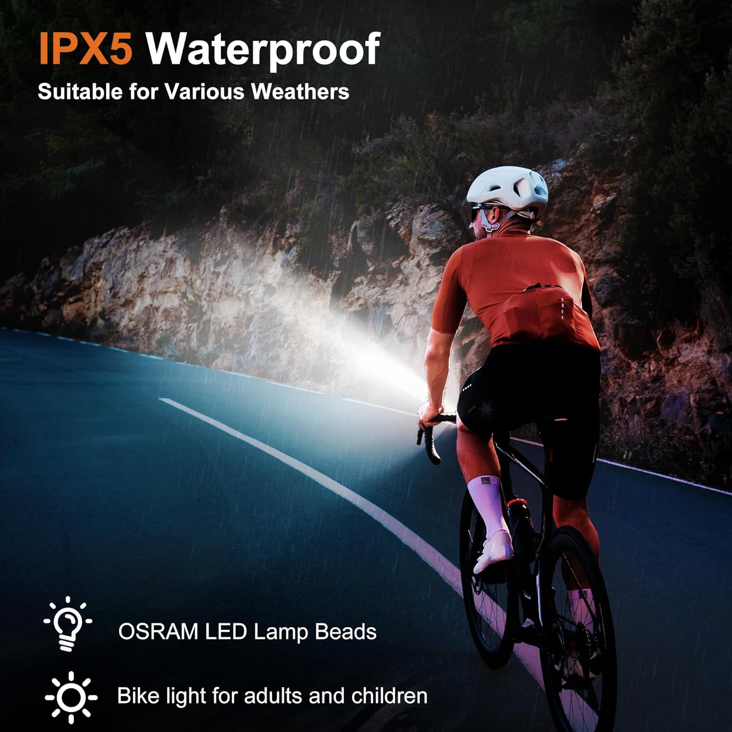 【IPX5 Waterproof】This front bike light reaches the IPX5 waterproof level, and the USB port is equipped with a waterproof silicone cover, which can effectively block water and extend its service life. It can be driven safely on rainy or foggy days, allowing you to enjoy cycling.