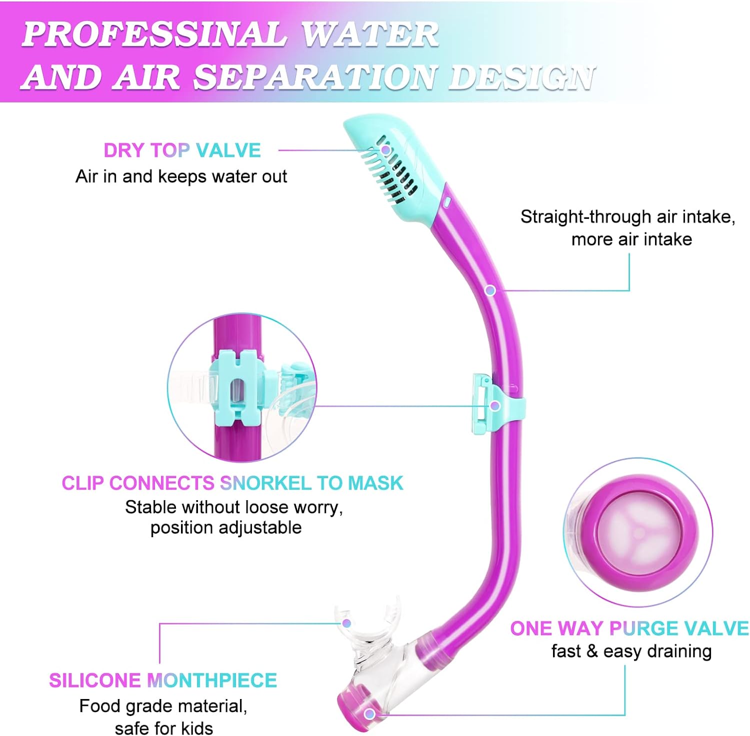 Our snorkel set is dry top snorkel, it keeps air in and prevents water from flowing in, it is friendly for beginners, the beautiful color is loved by kids.