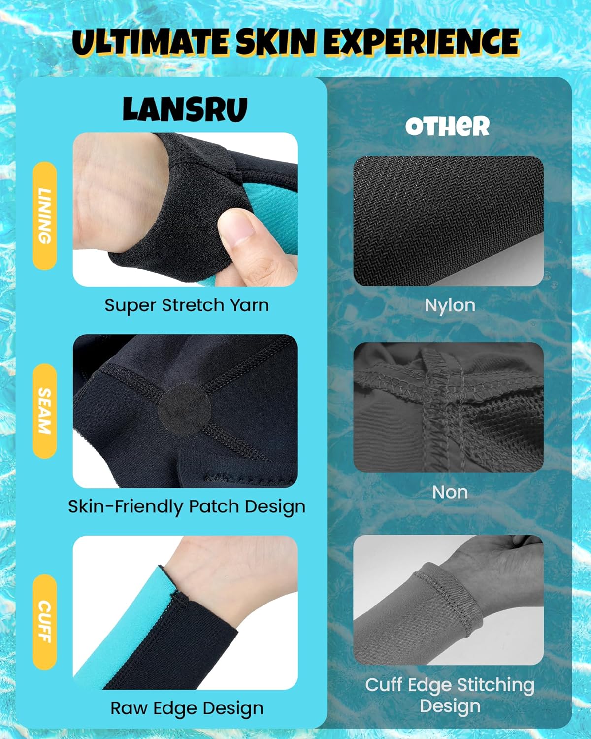 【Thermal 2.0】Lansru’s innovative SCR NEOPRENE offers superior elasticity compared to SBR used in regular kids’ wetsuits, ensuring a snug fit and increased insulation, reducing gaps caused by wrinkles. How does a wet suit keep warm? Neoprene absorbs water, expands, and adheres closely to the skin, effectively trapping a thin layer of water to prevent heat loss and prevent your child from losing temperature in water for a long time. Elastic fabric and well-fitted are the keys to keeping warm.
