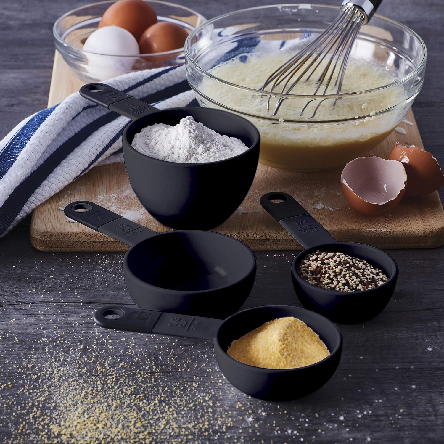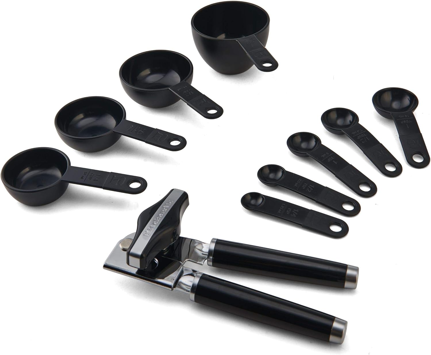 15 PIECE SET: This KitchenAid 15-Piece Tool and Gadget set includes a slotted turner, basting spoon, scraper spatula, euro peeler, multi-function can opener, utility whisk, set of 4 measuring cups (1 cup, 1/2 cup, 1/3 cup, and 1/4 cup), and set of 5 measuring spoons (1 tablespoon, 1/2 tablespoon, 1 teaspoon, 1/2 teaspoon, and 1/4 teaspoon).