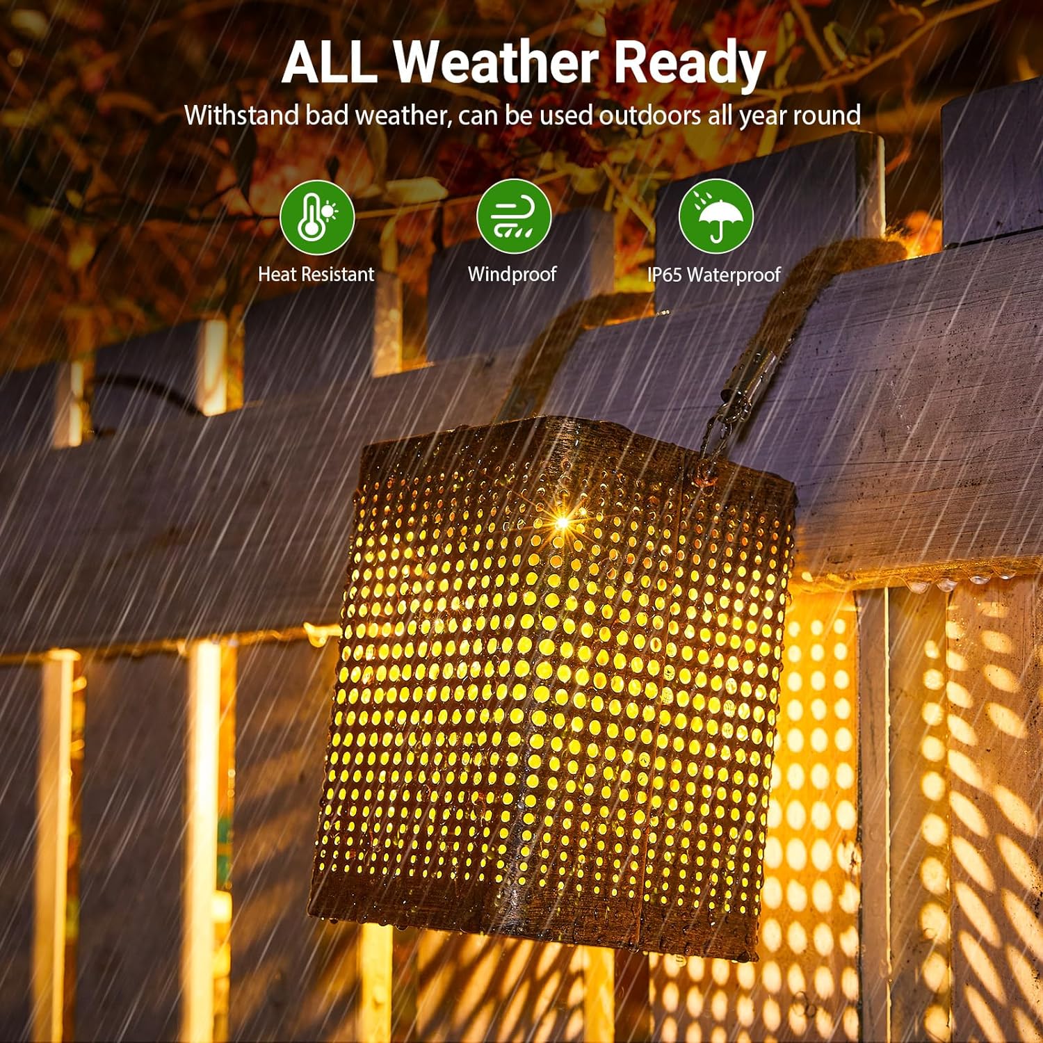 【High-quality Metal & All Weather Resistance】The outdoor Solar lanterns is made of a noble metal material that is corrosion-resistant, ensuring that the solar yard lights maintains its elegant appearance at all times and adds a tough aesthetic to outdoor spaces. The waterproof design of solar lanterns outdoor waterproof hanging provides comprehensive protection for your outdoor lighting needs, ensuring you can enjoy bright and cozy illumination in rain, snow, frost or sleet condition.