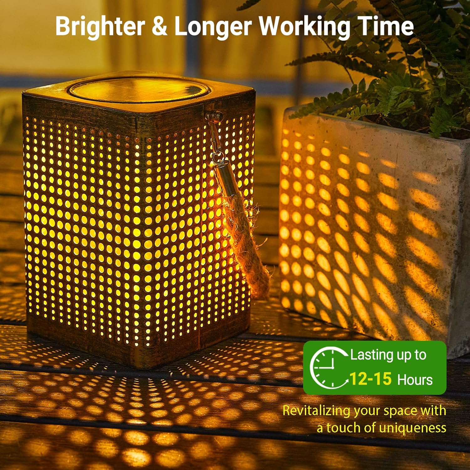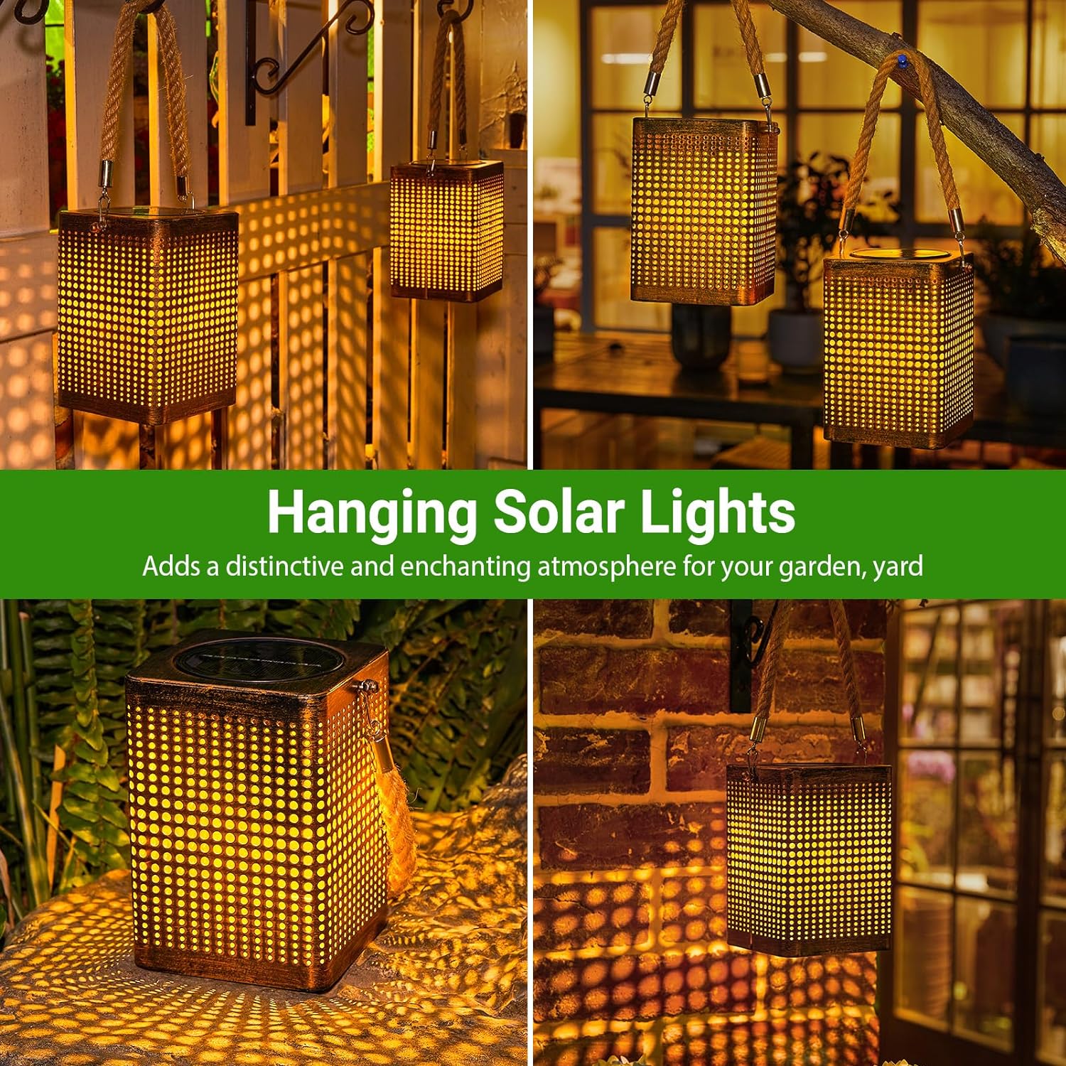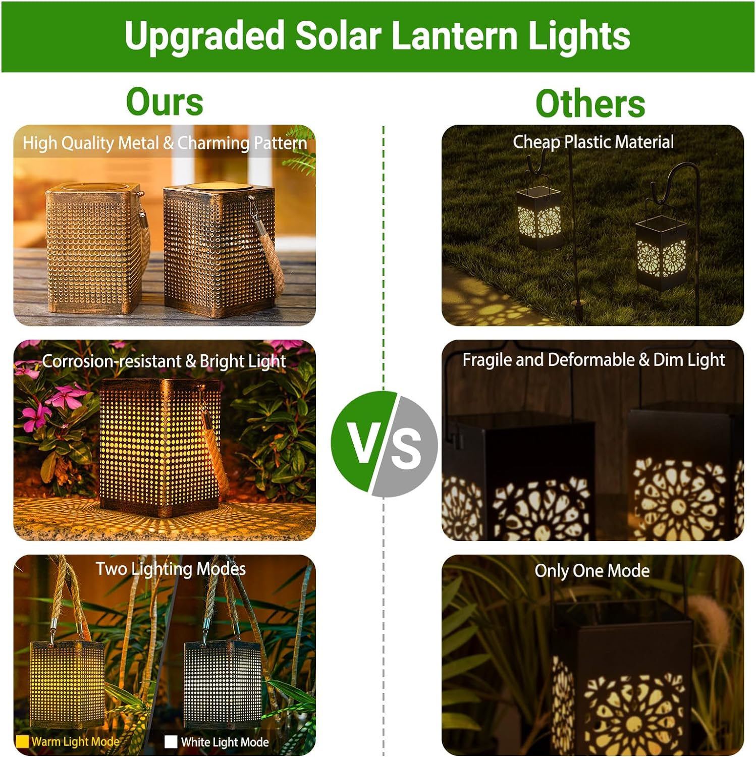 【Bigger Solar Panel & Brighter Outdoor Garden Decor】The solar panel of solar lanterns outdoor waterproof is made of larger and more efficient monocrystalline silicon, the charging efficiency is higher than other solar powered lantern. Solar lanterns outdoor hanging use upgraded SMD5050 LED beads, which creates a romantic and peaceful ambiance and are brighter than other Hanging solar lights outdoor waterproof. This Solar outdoor lights is perfect for your yard, garden decoration.