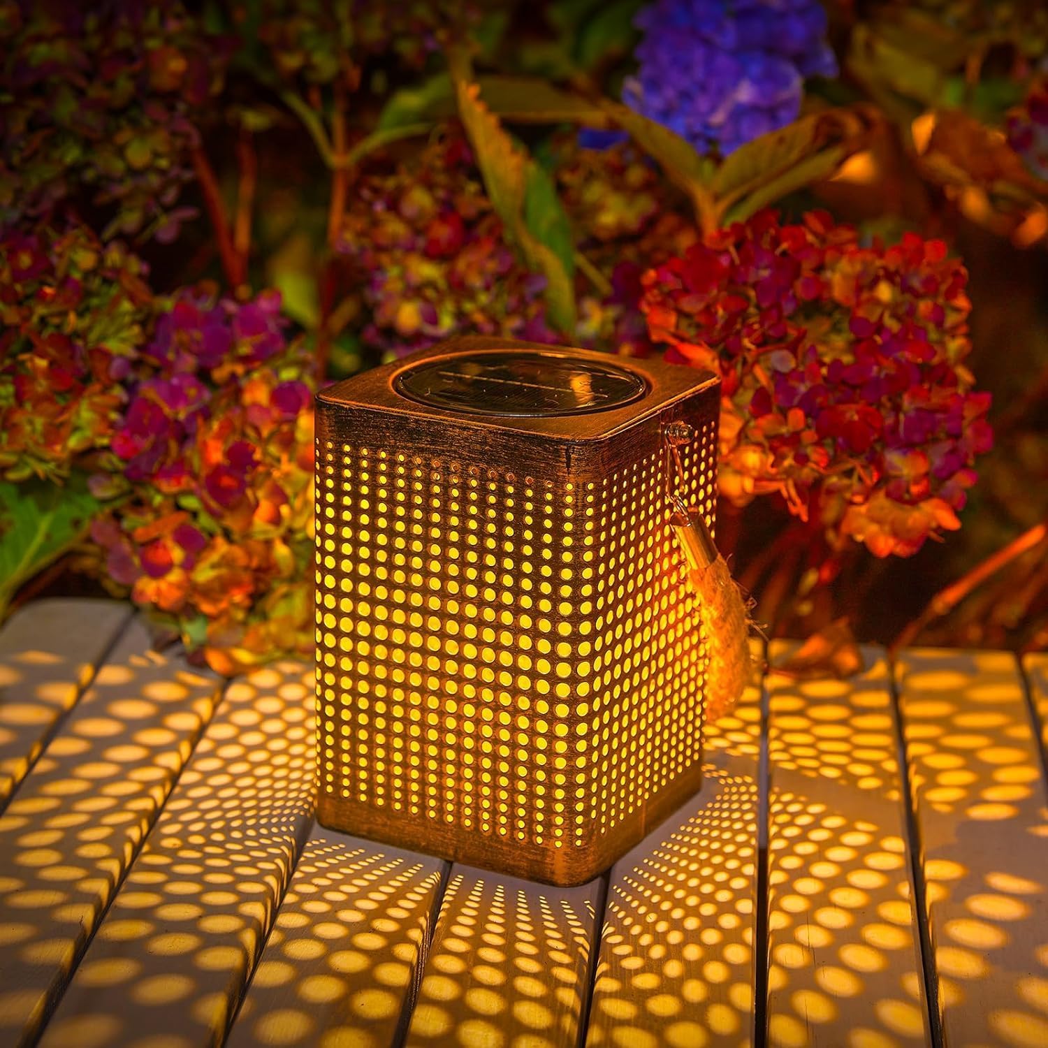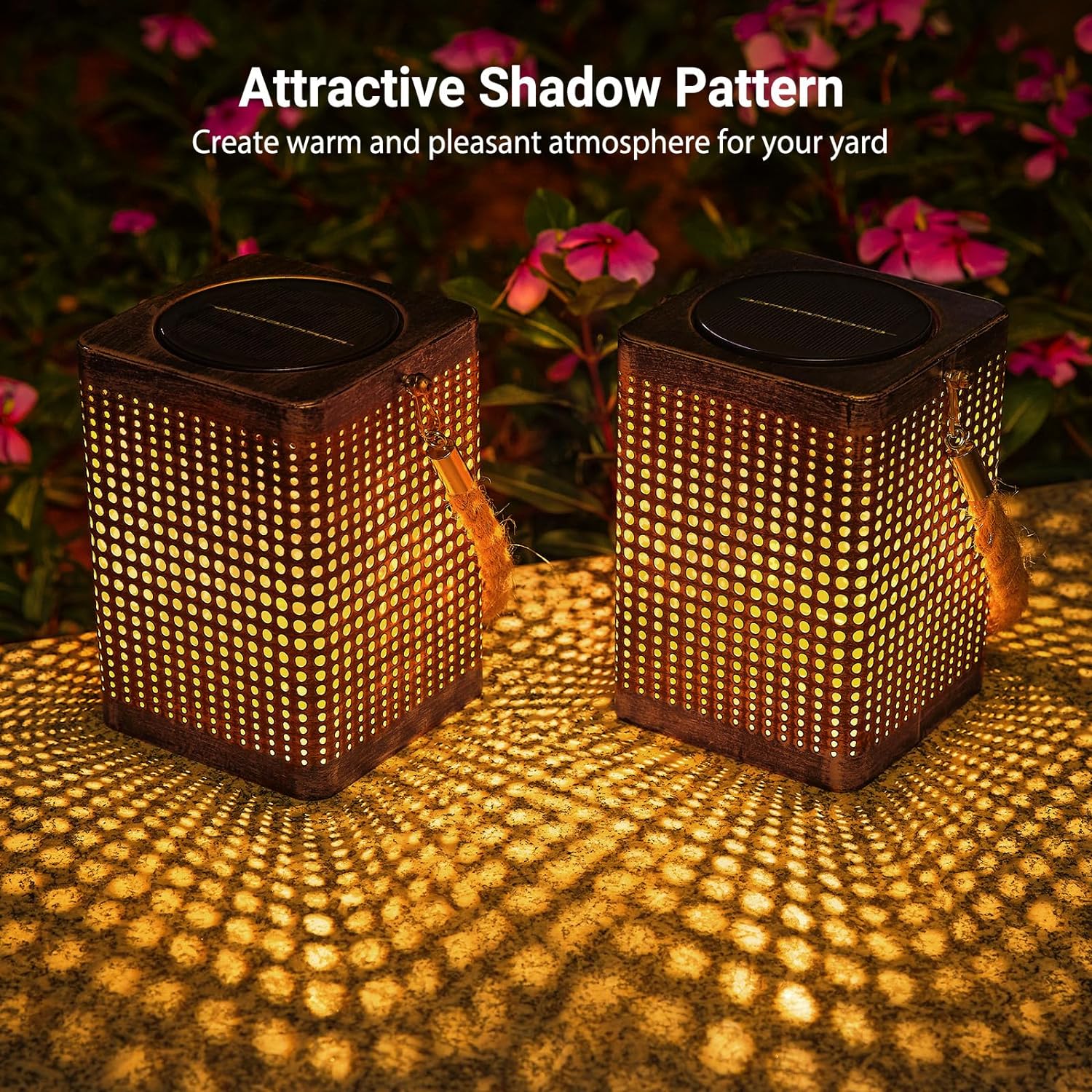 【Unique Design & Charming Patterns】This Solar lights outdoor features an antique bronze metal grid exterior, showcasing a retro and elegant charm. Solar lantern paired with a sophisticated vintage hemp rope handle, which make solar garden lights not only offers convenient portability but also enhances the overall design. What sets Outdoor solar lights apart is its captivating performance at night that projects mesmerizing light and shadow patterns onto the ground, creating a dreamlike ambiance.