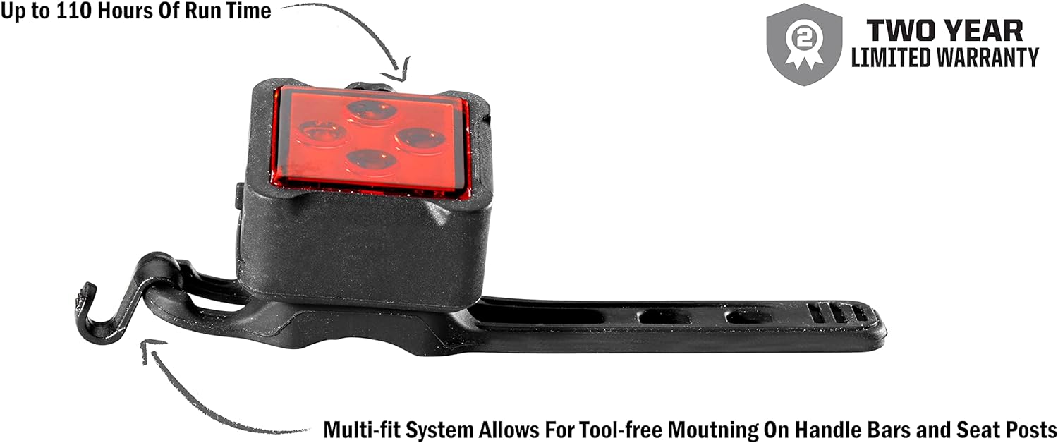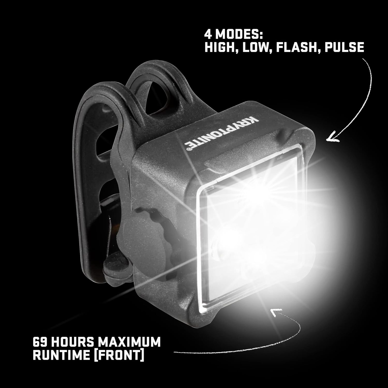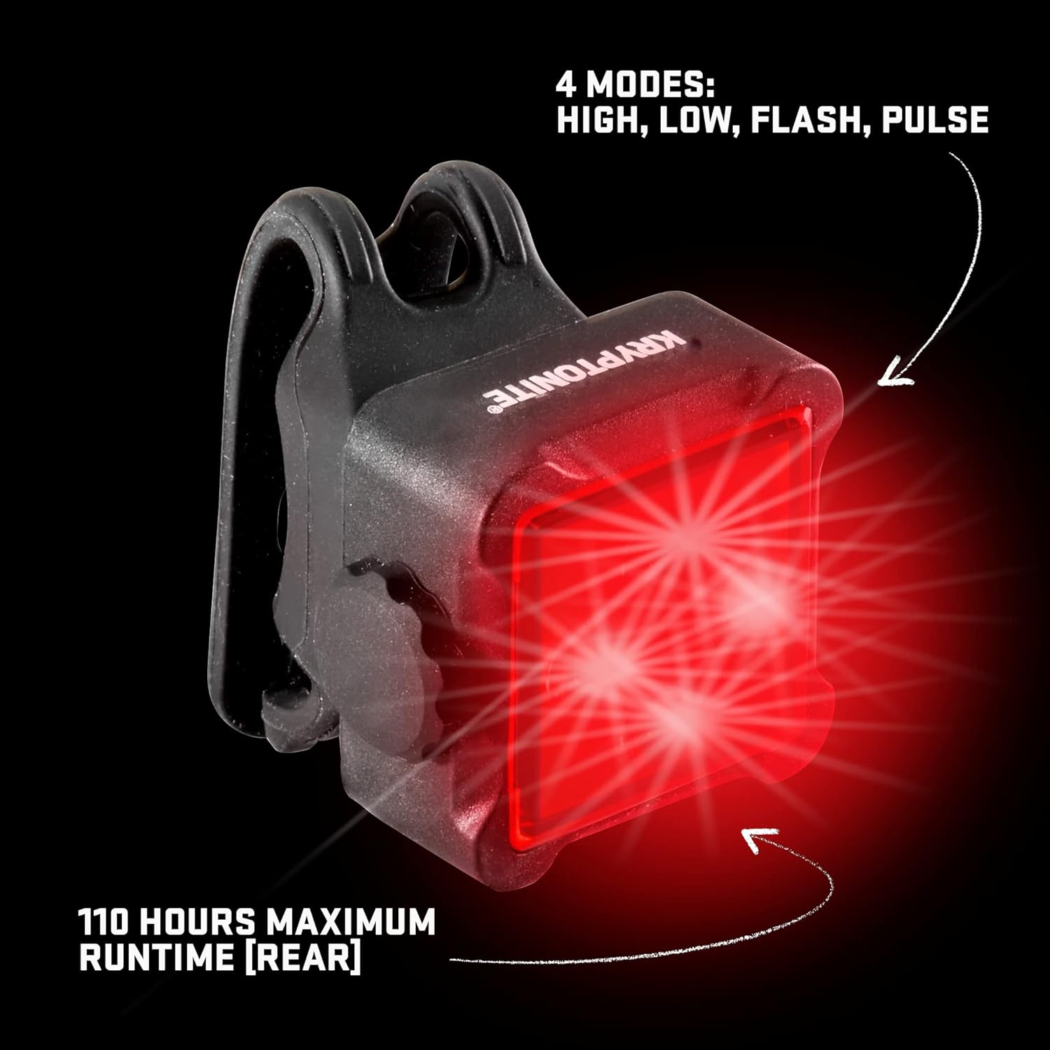 4 LIGHT MODE OPTIONS: The high-powered front and back bike lights include day and night use with run times are Rear Steady: 54 hrs, Rear Flash: 110 hrs, Front Steady: 62 hrs. Front Flash: 69 hrs