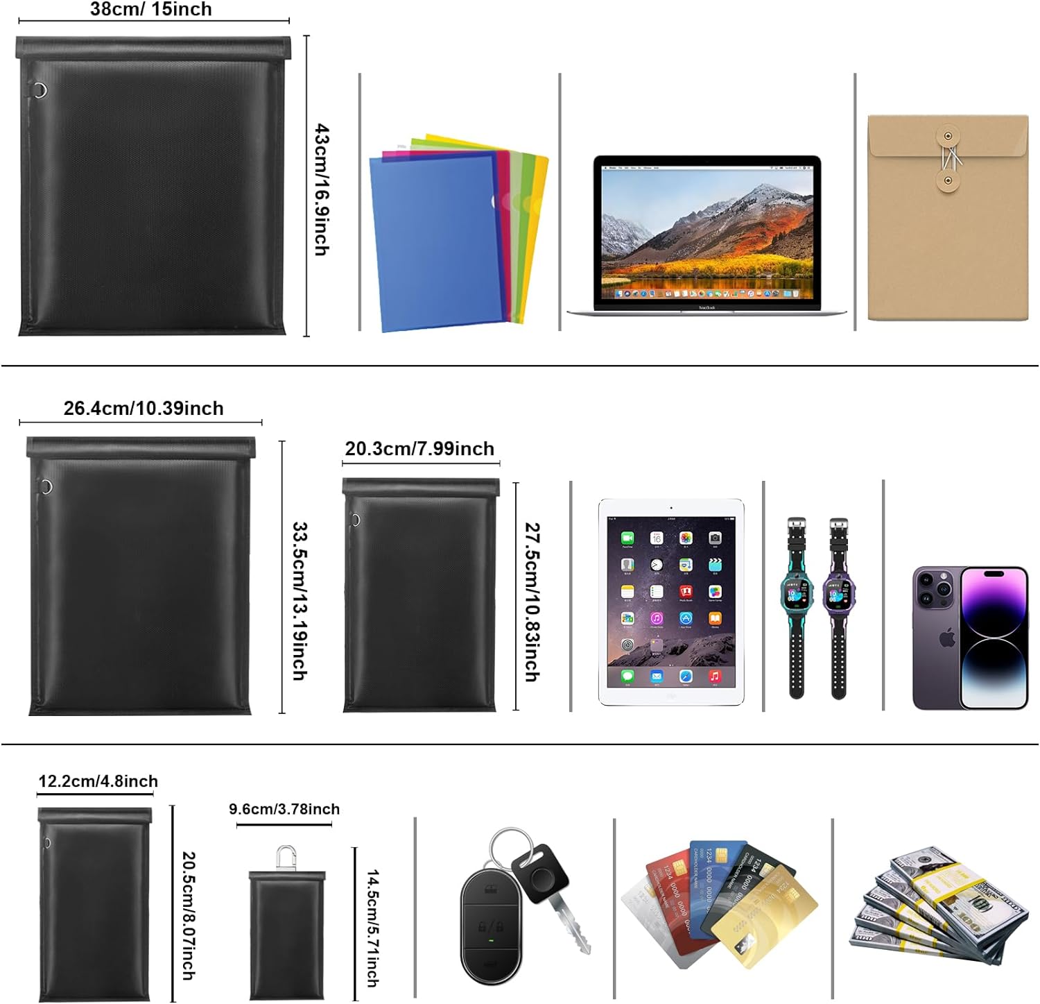 【5 PCS Faraday Bags】-Oversized faraday cage (16.93″×15″)*1, fits for large laptops, files, magazines, GPS units; large signal blocking pouch(13.19″×10.39″)*1, fits for tablets, phones, radios and other electronic devices; medium faraday bag for phones(10.83″×7.99″)*1; small faraday bag (folded Size 8.07″×4.84″)*1, fits watches, cards, cash, car Key remotes, transponders, bluetooth, passports; rfid key fob protector bag ( folded size 5.71″×3.78″)*1. Various sizes can meet your different needs.