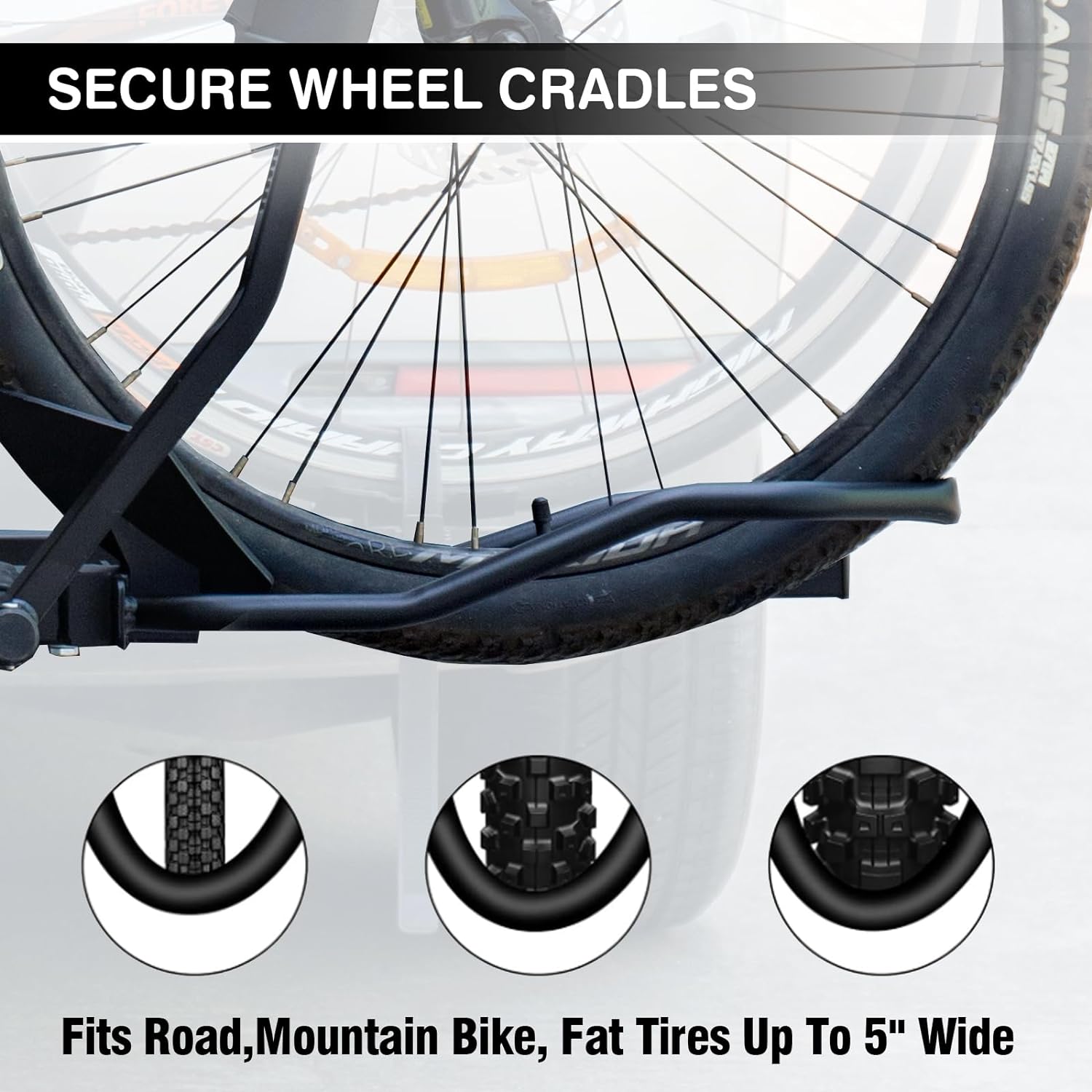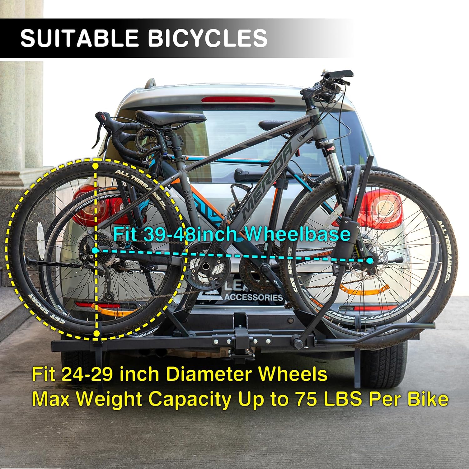 [ Suitable Bicycles ] – Easily transports 2 bicycles, Max capacity of 65 Ibs per bike .Fits most frame bicycles,with 24-29 inch wheels,39-48 inch wheelbase,up to 5 inch Fat Tire. Not suit for small wheel (under 24 inch) bikes.