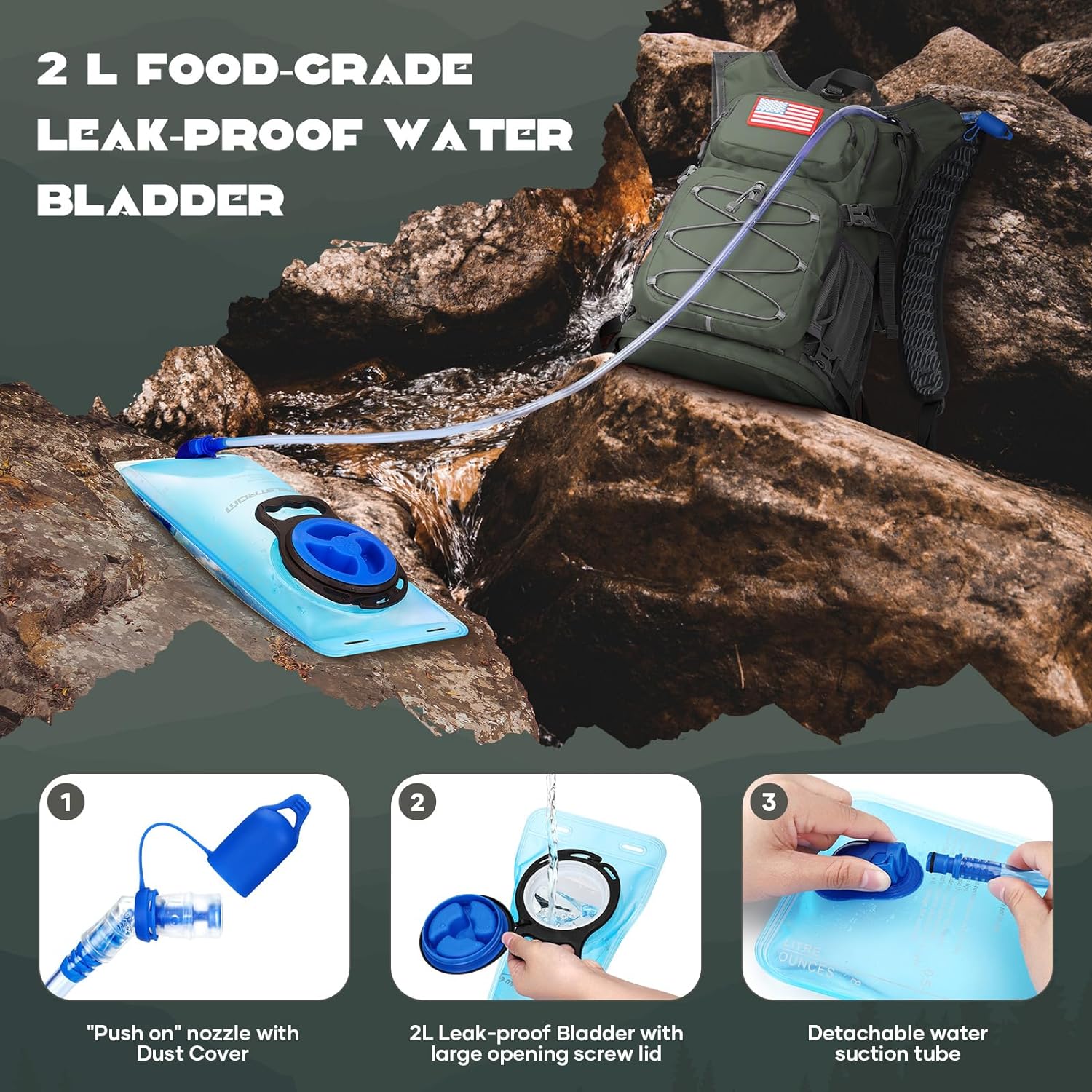 Hands-Free Leakproof Water Bladder: Stay hydrated on the go with a 2-liter bladder and bilateral hose outlets. The large opening design of the bladder ensures easy filling and cleaning. The separate insulated compartment provides hours of cooling with ice packs. The bladder is replaceable and supports up to 3 liters.