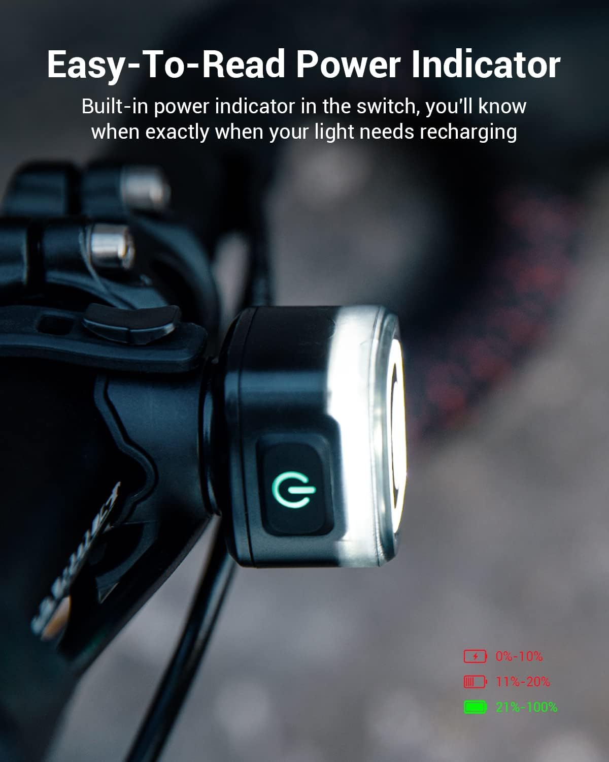 LONG RUNTIME & BATTERY INDICATOR – The bicycle lights set with USB rechargeable only takes 1 hour to fully charge, and the maximum usage time in low-power mode is 31.4hours(headlight),or 44 hours(back light).The single-click of switch will automatically display the power status of the tail light for three seconds. Green: 21%-100%; Red: 11%-20%; Red Flash: 1%-10%