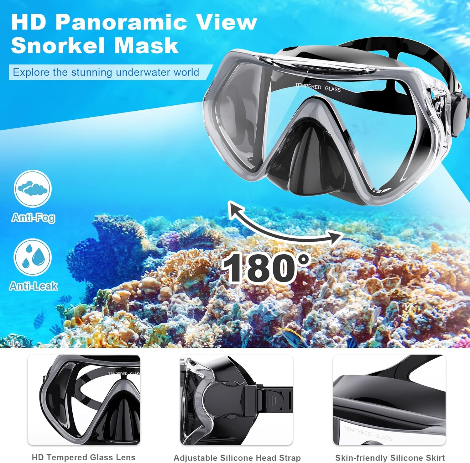 [180° Panoramic View Snorkel Mask] The Panoramic window design and durable anti-fog tempered glass lens of the diving mask provide users with wide-clear vision and secure eye protection. This snorkeling mask features an upgraded soft elastic skirt and an easy-adjust buckle system, which can prefect fit various face shapes with reliable watertight seal and maintain comfort during extended periods of underwater use.