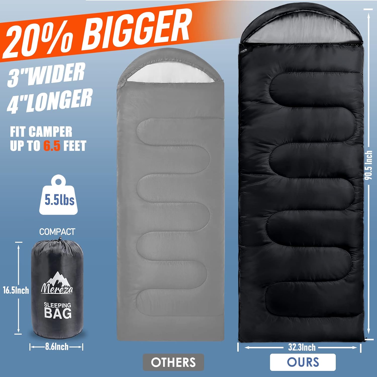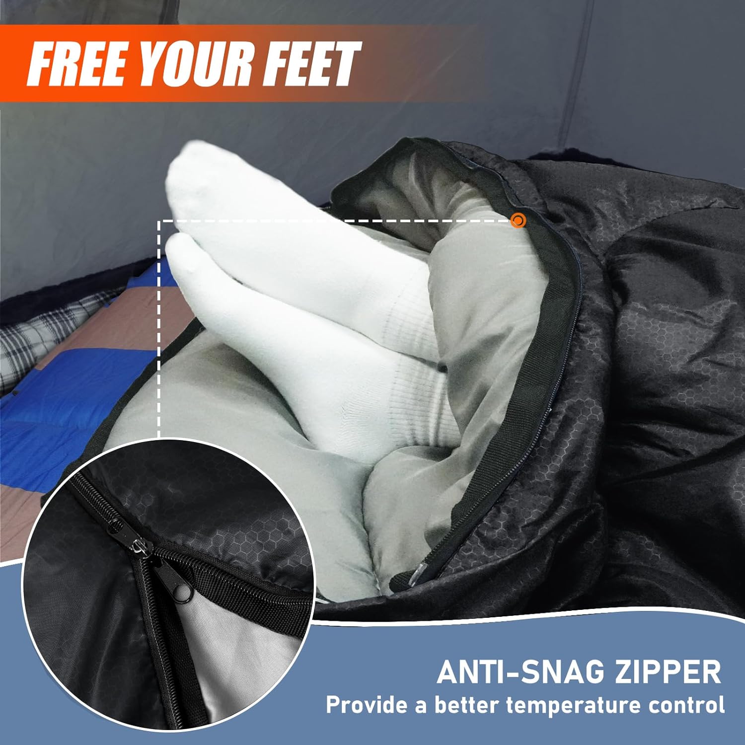 MORE SPACE FOR YOU : The boxy shape is like your bed at home: spacious and comfy, fits most campers up to 6.5 FEET. Size: 90.5 x 32.3inches, 20% larger than most outdoor sleeping bags on the market, plenty of space to stretch or roll over. The separated bottom zipper lets you ventilate the foot section for better temperature control. On warm nights, unzip it and use like a blanket.