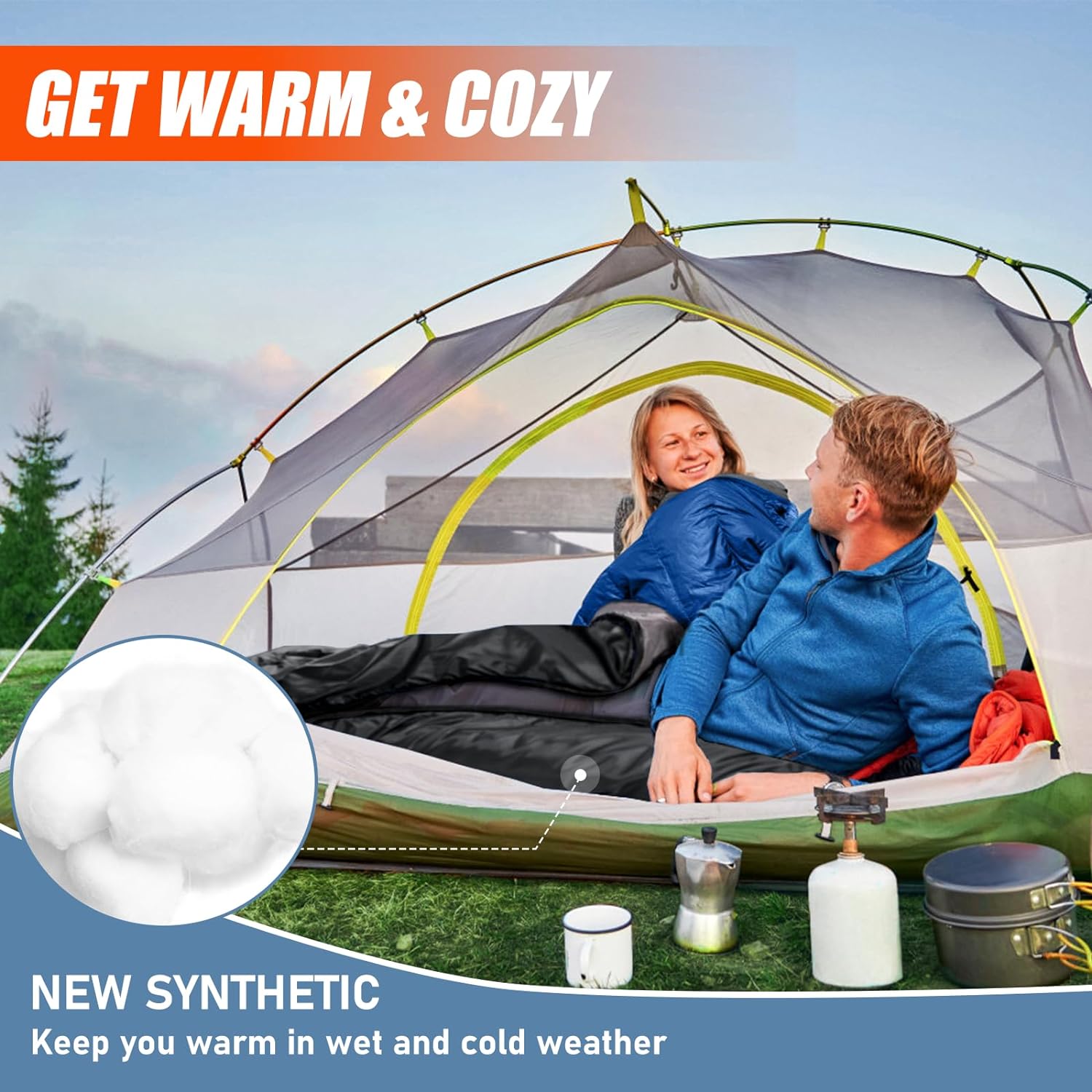 KEEP WARM DESIGN & WATERPROOF FABRIC : 210T ripstop waterproof polyester shell protects against windy, keep you warm even in cold weather conditions. New synthetic insulation filling offers solid performance. It continues to insulate when wet, prevent you from getting damp. The camping sleeping bag is designed for machine washing as well, ensuring easy maintenance and longevity.