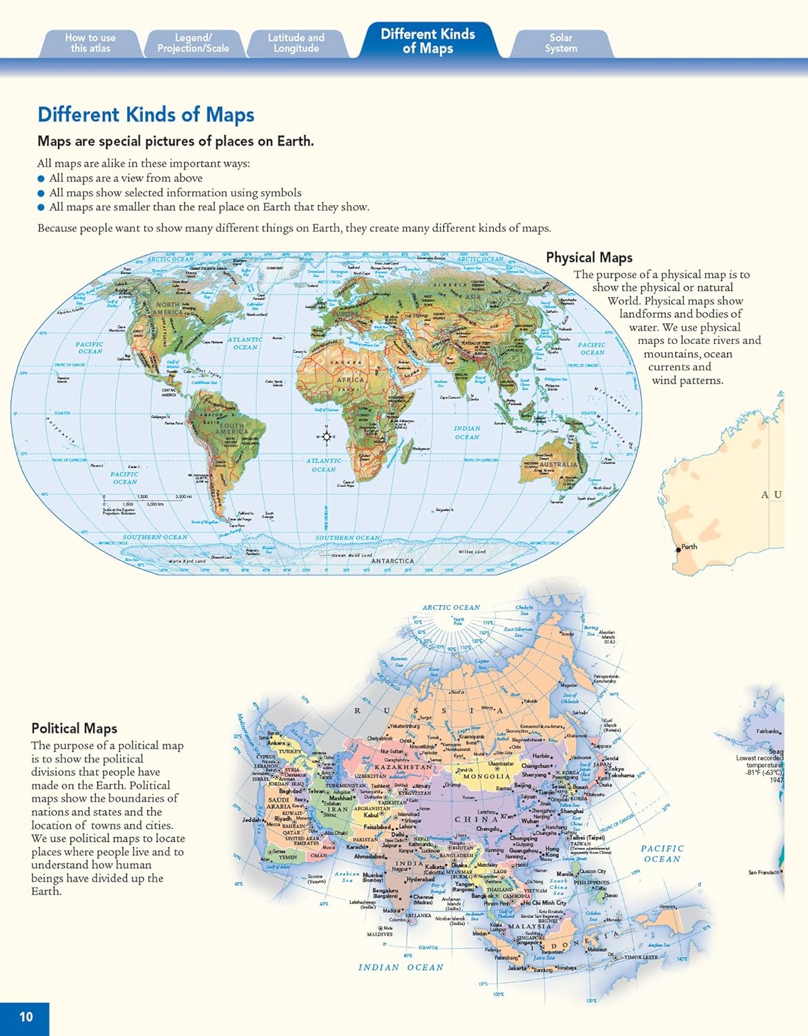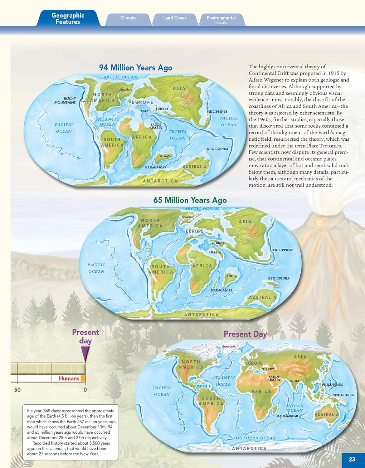 Discover the world’s landforms and bodies of water, the highest and lowest elevations, and learn more about ocean currents, and wind patterns. Thematic maps cover diverse topics such as continental drift, ocean floor, climate, natural resources, and population density.Features up-to-date statistics and global information.