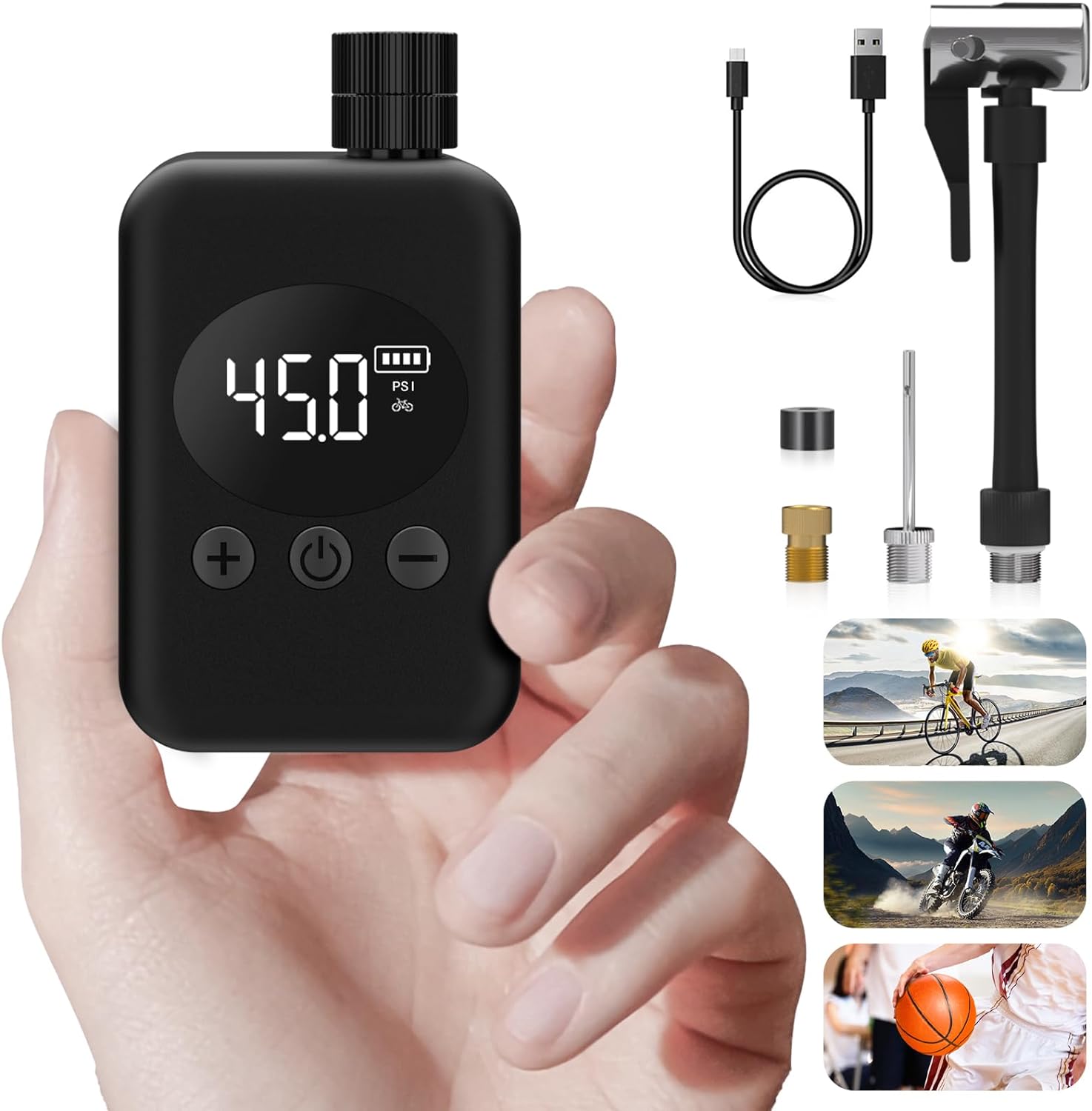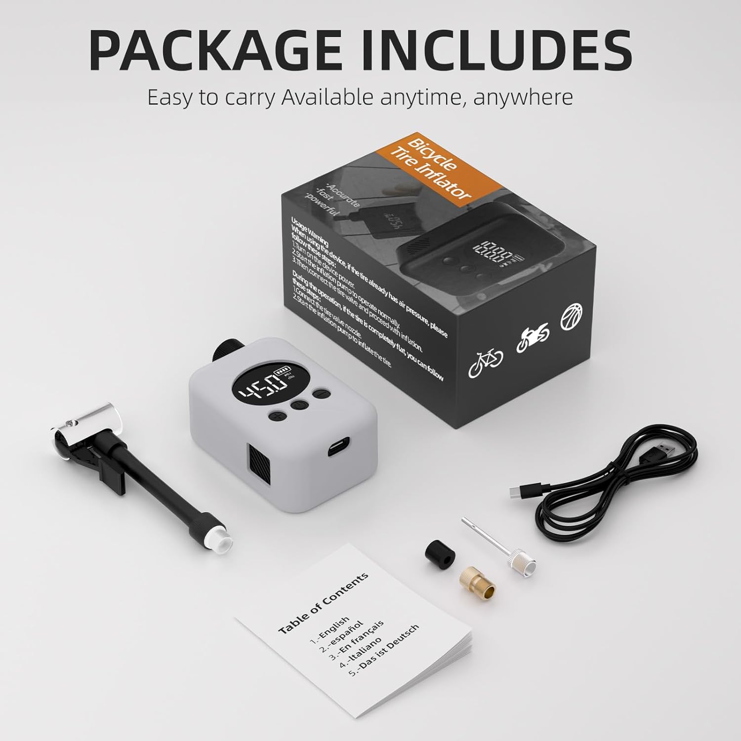 Mini Yet Powerful: No more manual effort needed—simply press a button, and your bicycle tire can be inflated from 0 psi to 45 psi in just 45 seconds. Enhance your riding experience with smoother inflation. The electric bike air pump uses a Type-C USB cable for charging and can be fully charged in just 45 minutes. With a full charge, you can easily inflate 5 tires of 700X25C from 0 to 60 PSI.