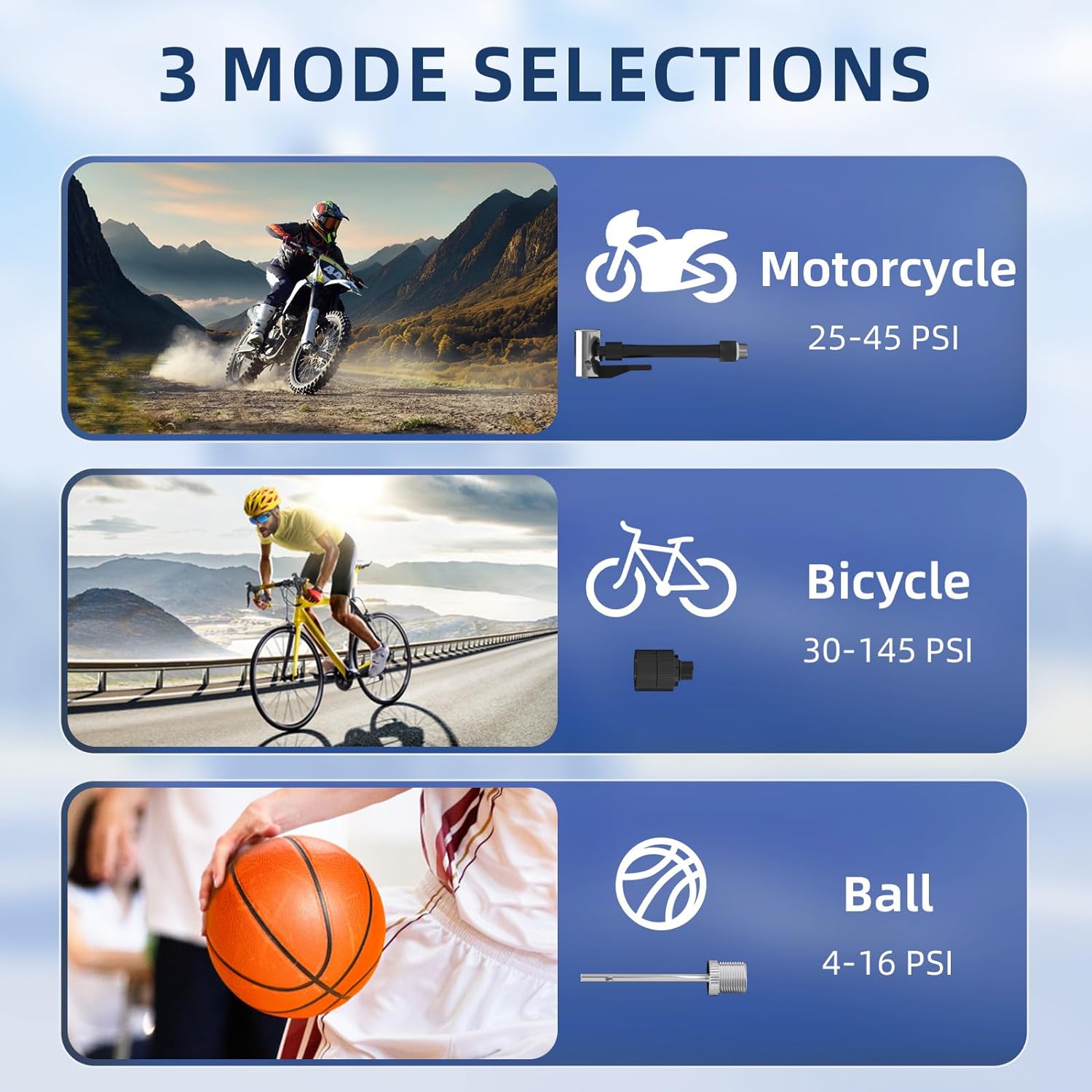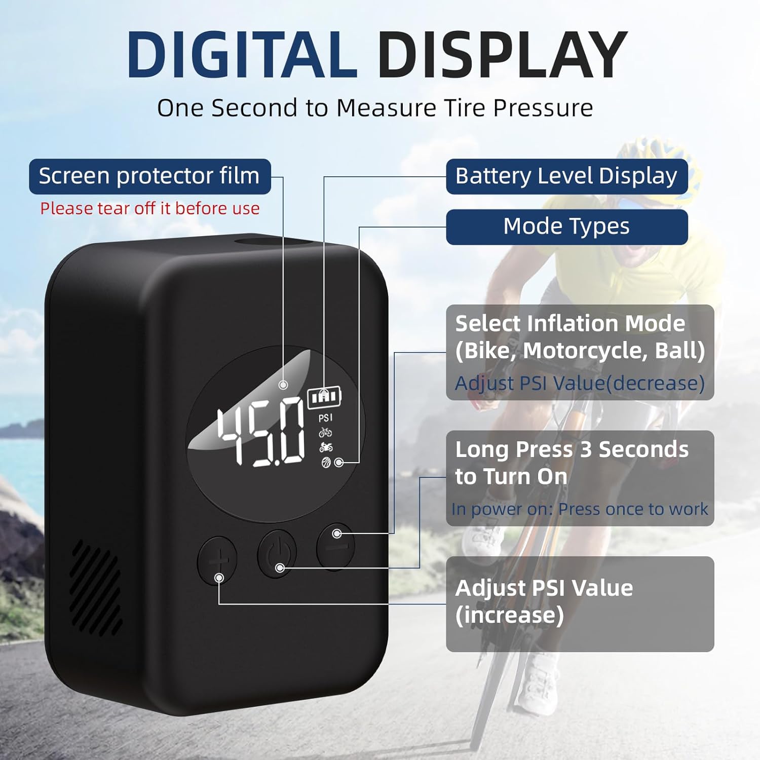 Tire Pressure Detection and Preset: The maximum air pressure of the mini bicycle pump is 150 PSI, equipped with a display screen that allows clear reading of detailed numerical values. The mini bike pump electric is equipped with tire pressure monitoring function and allows you to set the desired PSI. The mini bike pump will automatically shut off when the preset value is reached, eliminating worries about over-inflation and ensuring safety during use.
