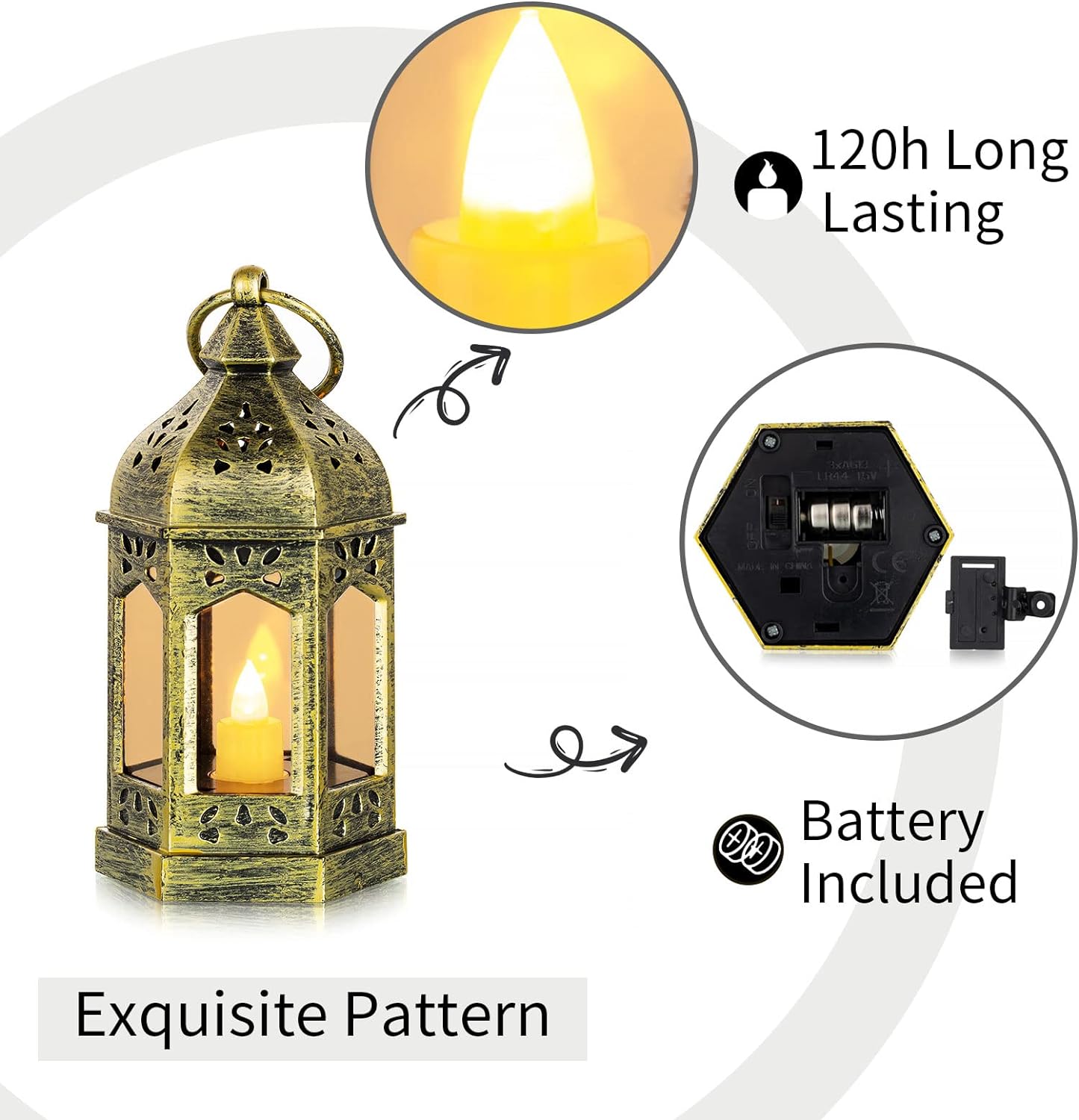 Atmosphere Addition: The gold vintage lantern has a built-in flameless candle, flickering like a real candle, emiting yellow candlelight glow to create a warm and romantic atmosphere, the light lasts for more than 120 hours. With this fume-free, odor-free, and fire-hazard-free LED lantern, you can enjoy the same ambiance as a real candle.