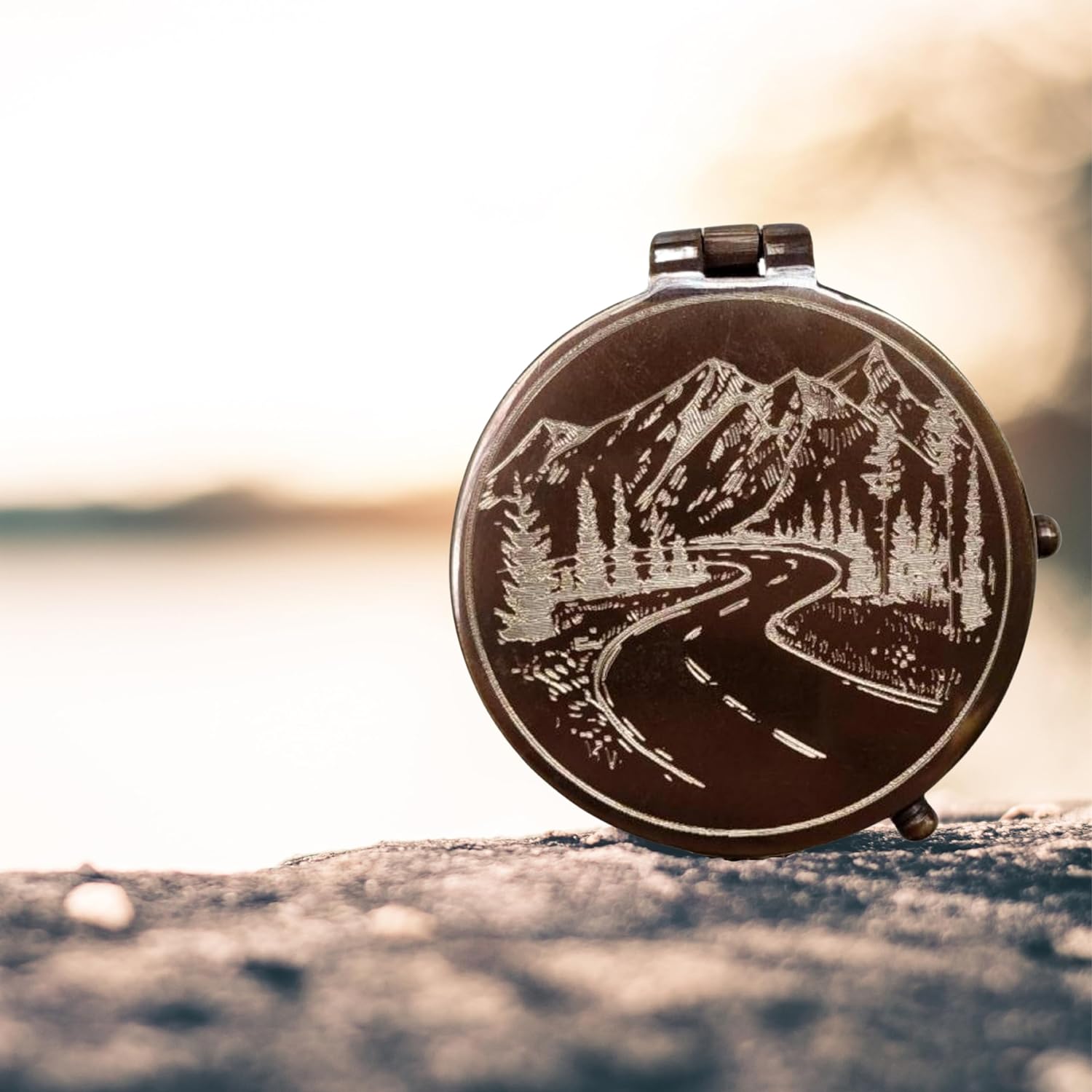 Mountains and Road Engraved Working Handmade Antiqued Brass Compass Gift for Men with ”For Your Adventures” Stamped Leather Case, Anniversary Gifts for Him