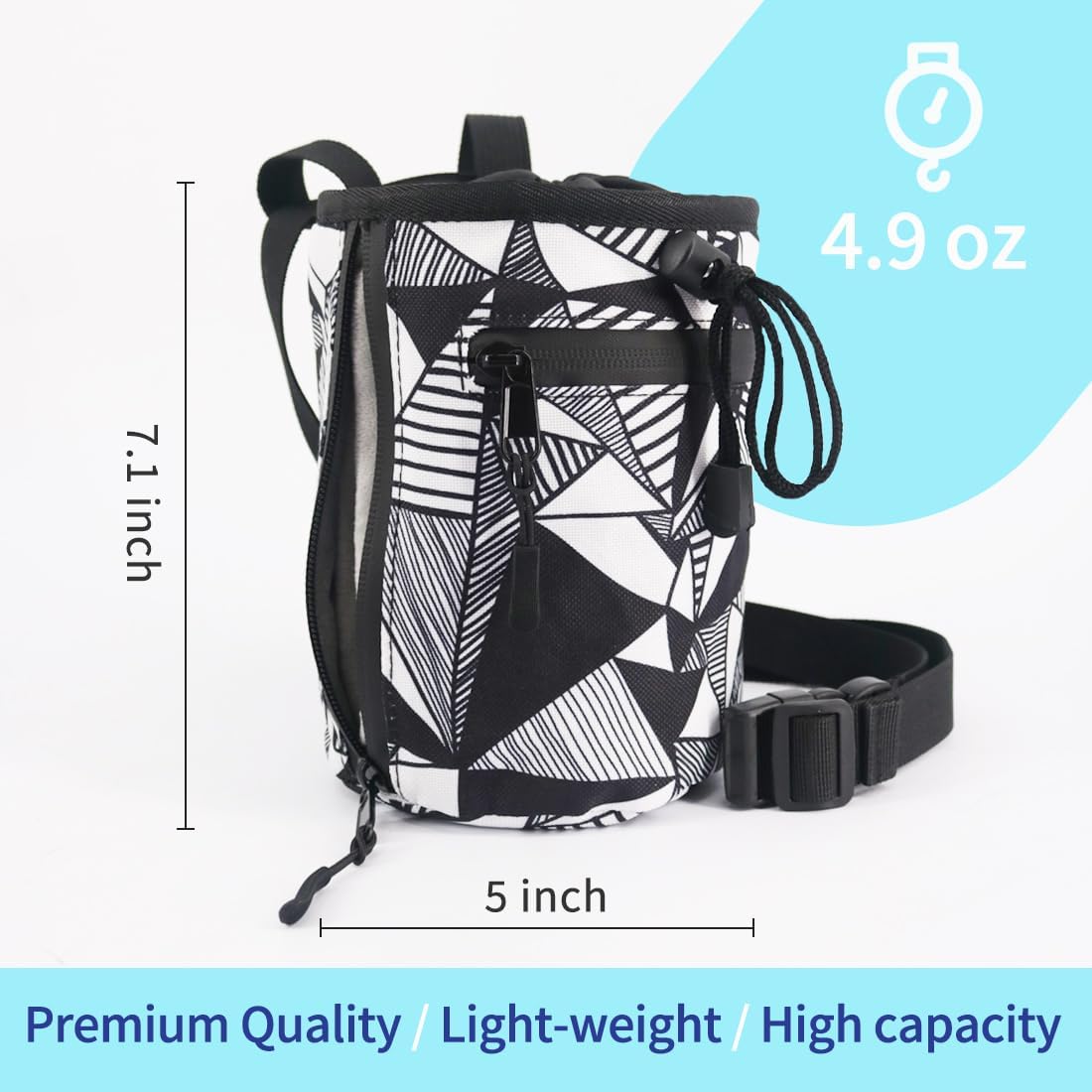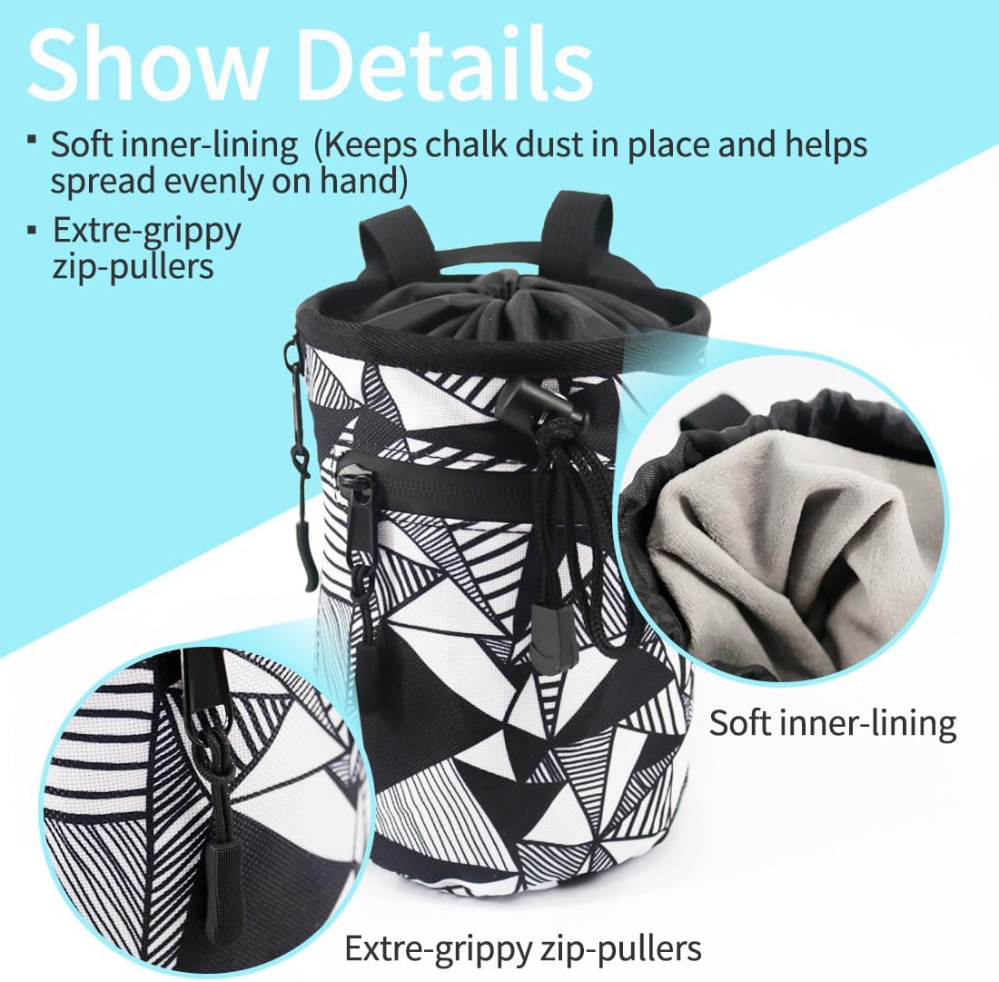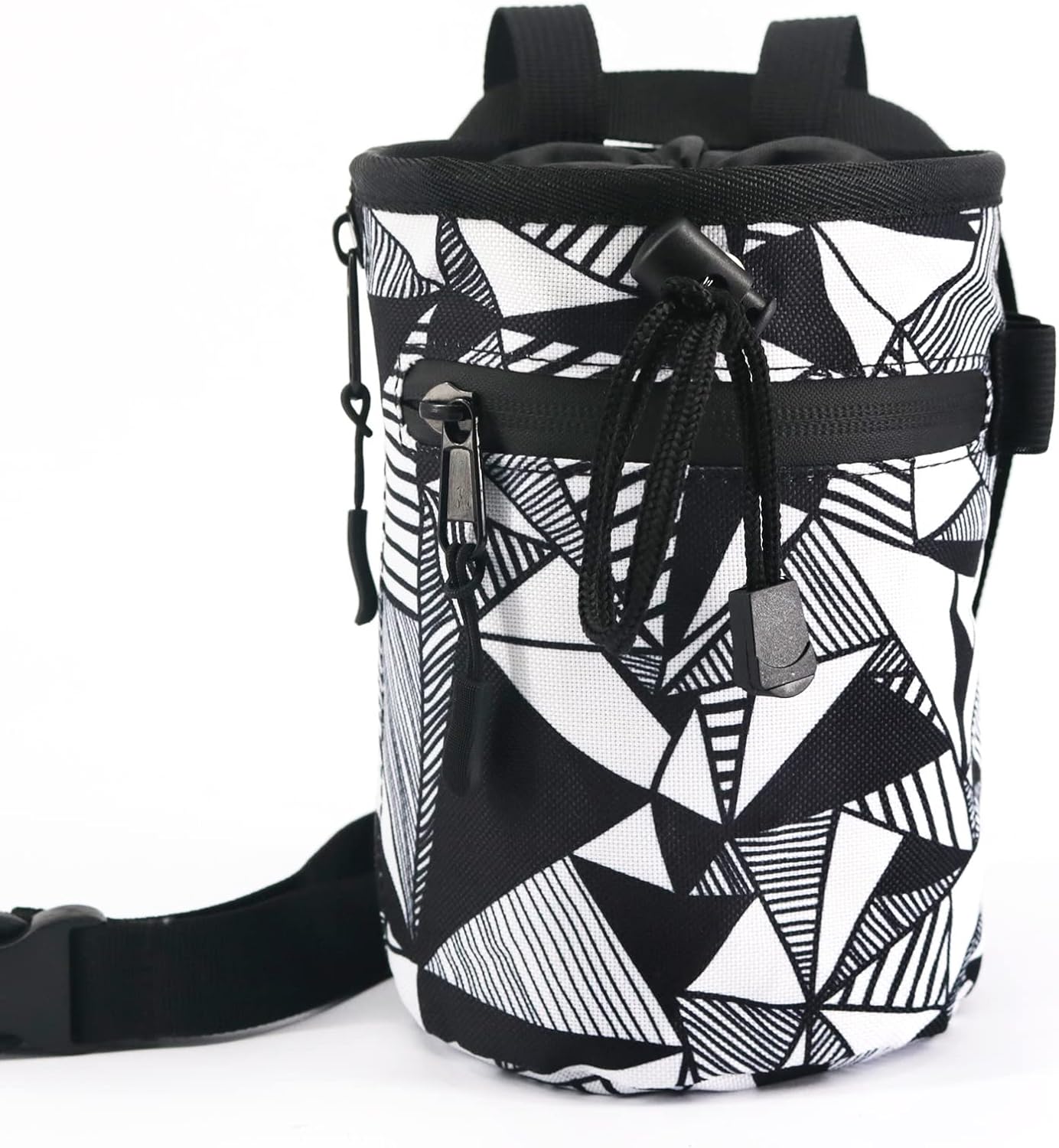 Adjustable draw cord closes tight the opening to prevent chalk spillage. 2 large zipper pockets to keep your wallet, keys, and phone secure and out of the way.