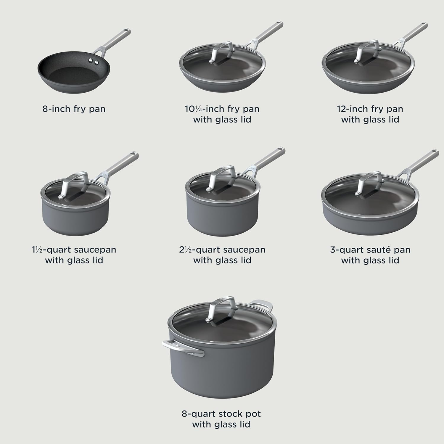 WHAT’S INCLUDED: 8-Inch Fry Pan, 10.25-Inch Fry Pan with Glass Lid, 12-Inch Fry Pan with Glass Lid, 1.5-Quart Saucepan with Glass Lid, 2.5-Quart Saucepan with Glass Lid, 3-Quart Sauté Pan with Glass Lid & 8-Quart Stock Pot with Glass Lid.