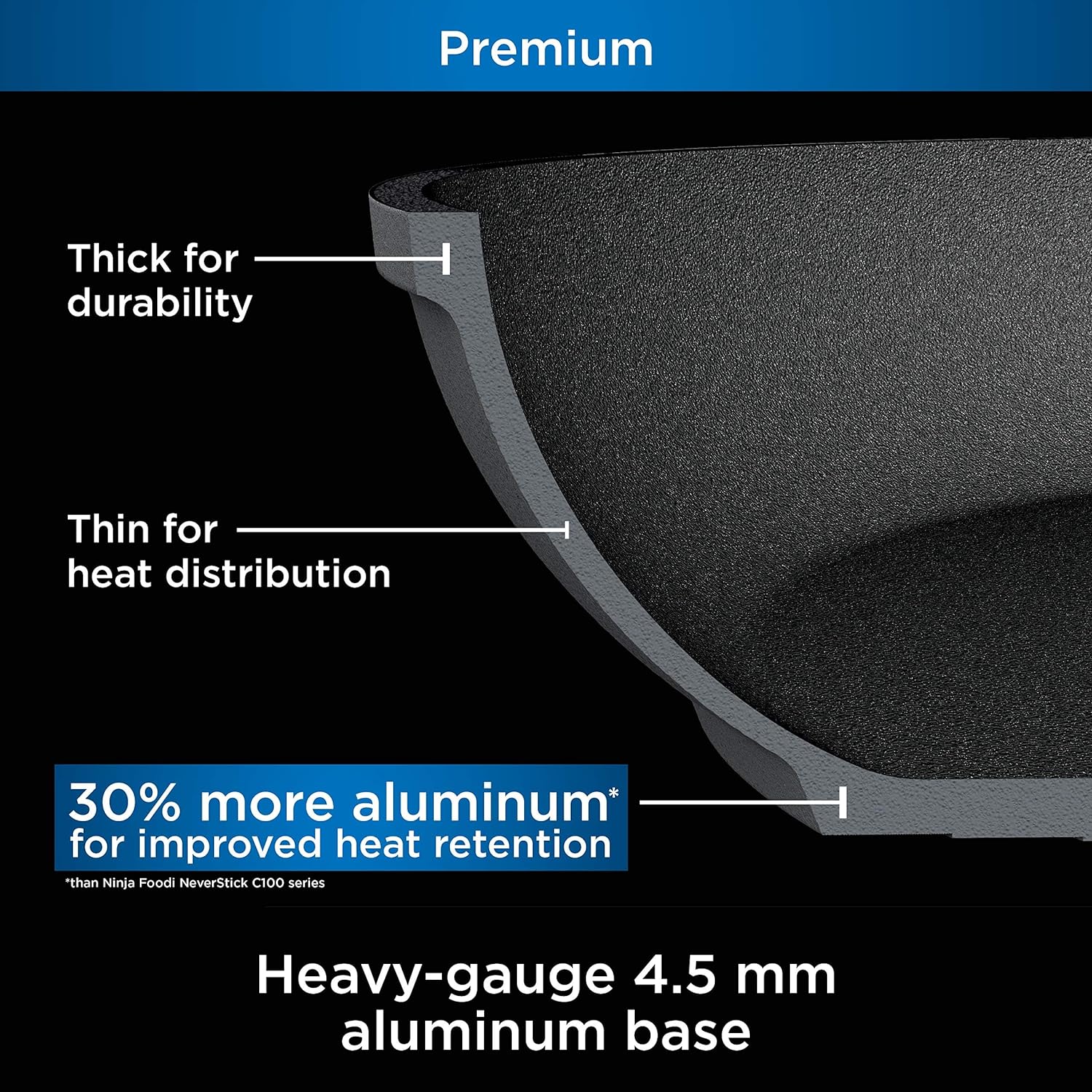 IMPROVED HEAT RETENTION: The heavy-gauge 4.5 mm aluminum base is designed to prevent hot spots and to enable quick, even heat distribution for perfect results every time. Contains 30% more aluminum than Ninja Foodi NeverStick Essential C100 series.