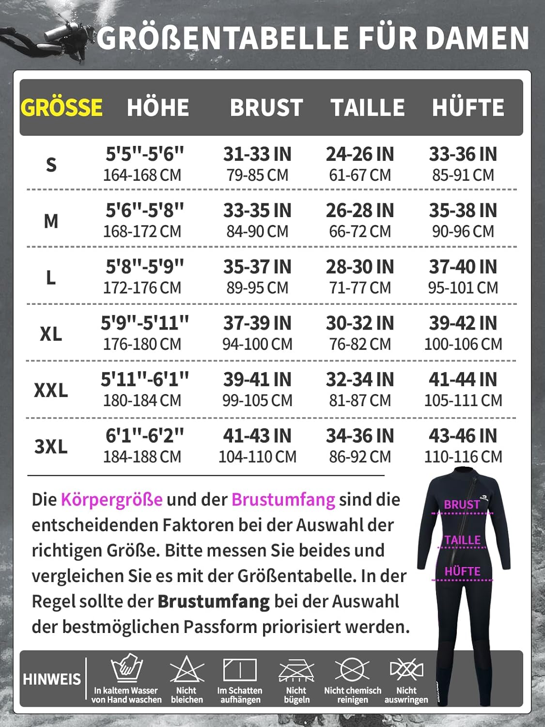 π[Size Tips] Make sure to use Chest Waist Hip as the first reference factor. Please DO NOT choose a size based on the clothes you normally wear or other diving suits