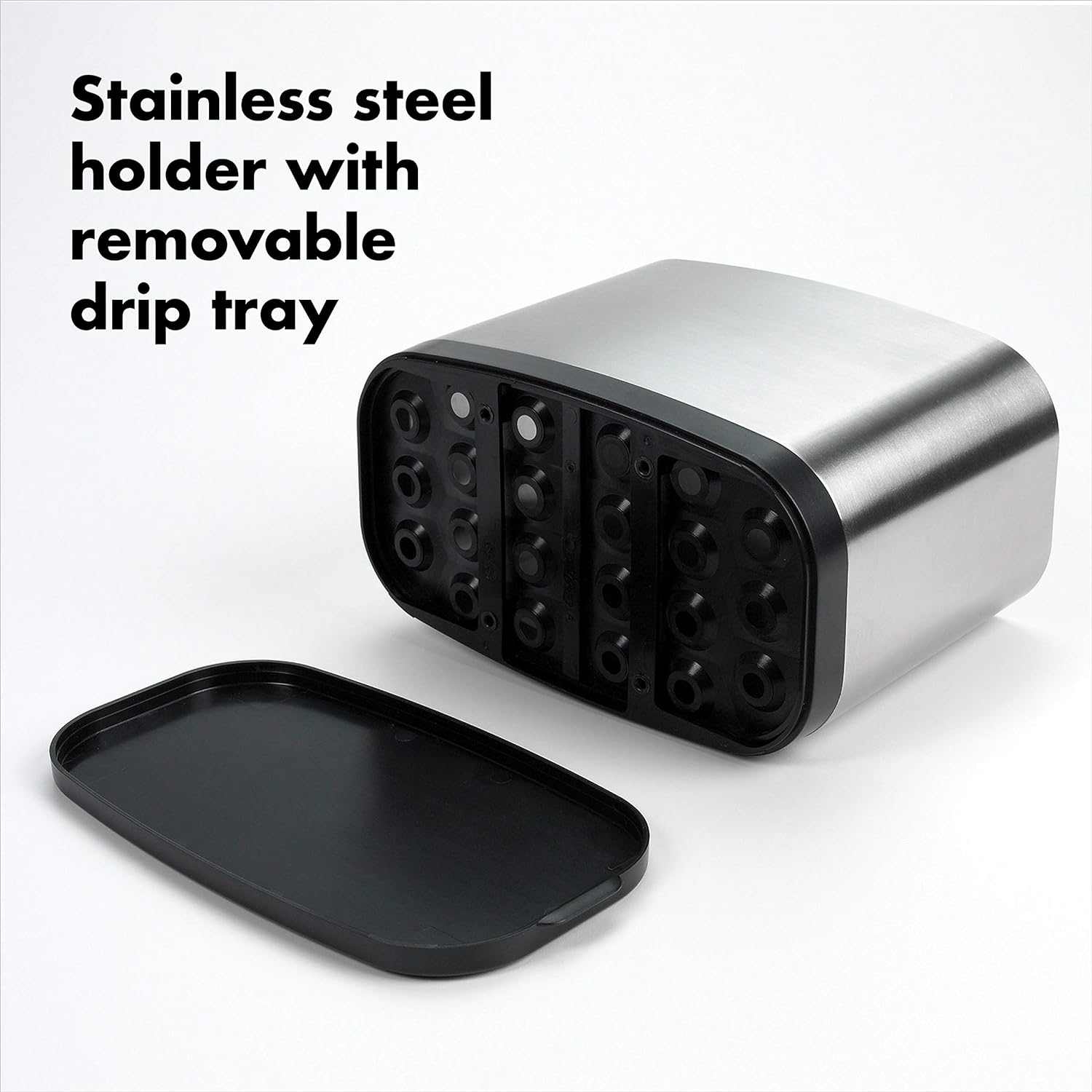 Large capacity utensil holder includes a removable drip tray; dishwasher safe. Style of base may vary.
