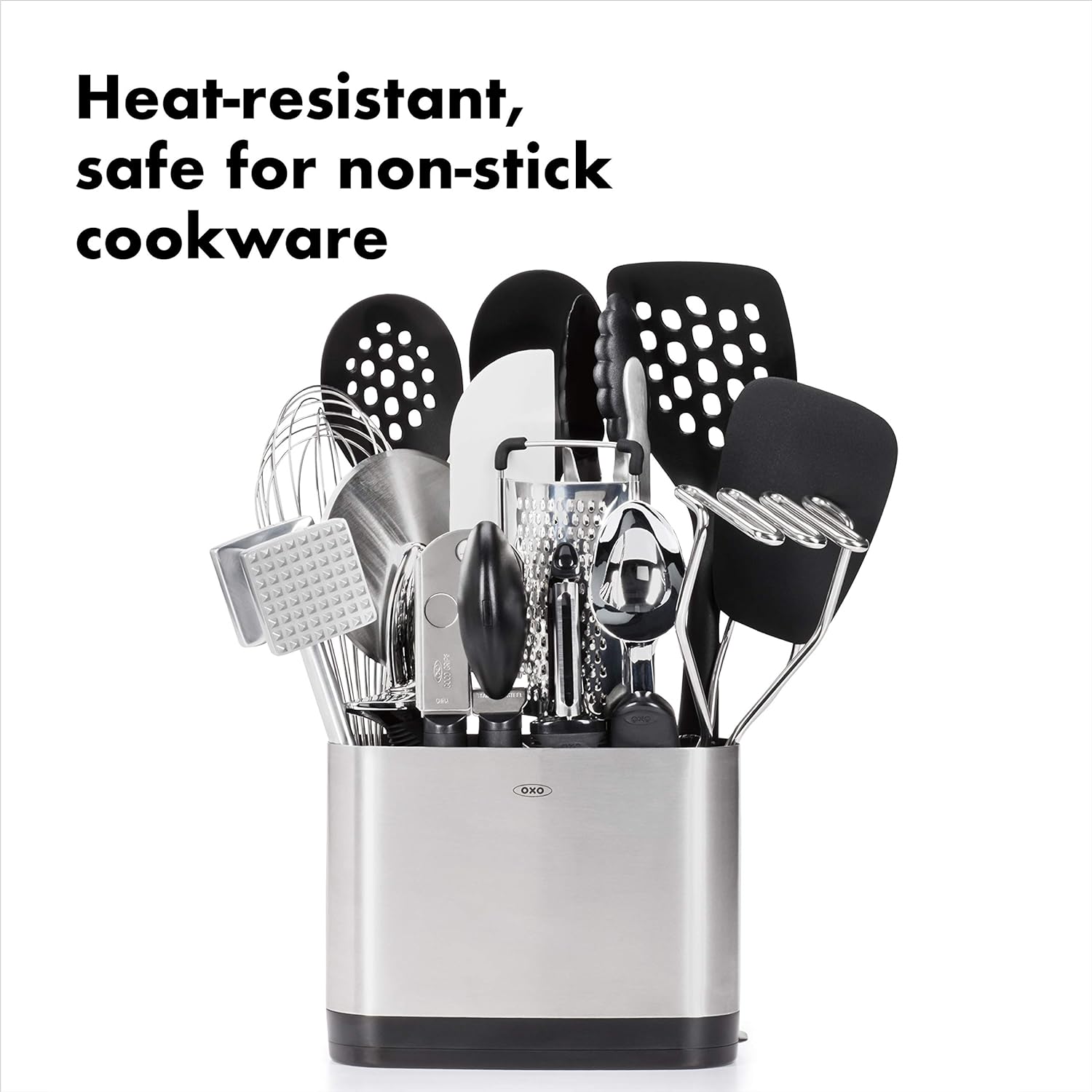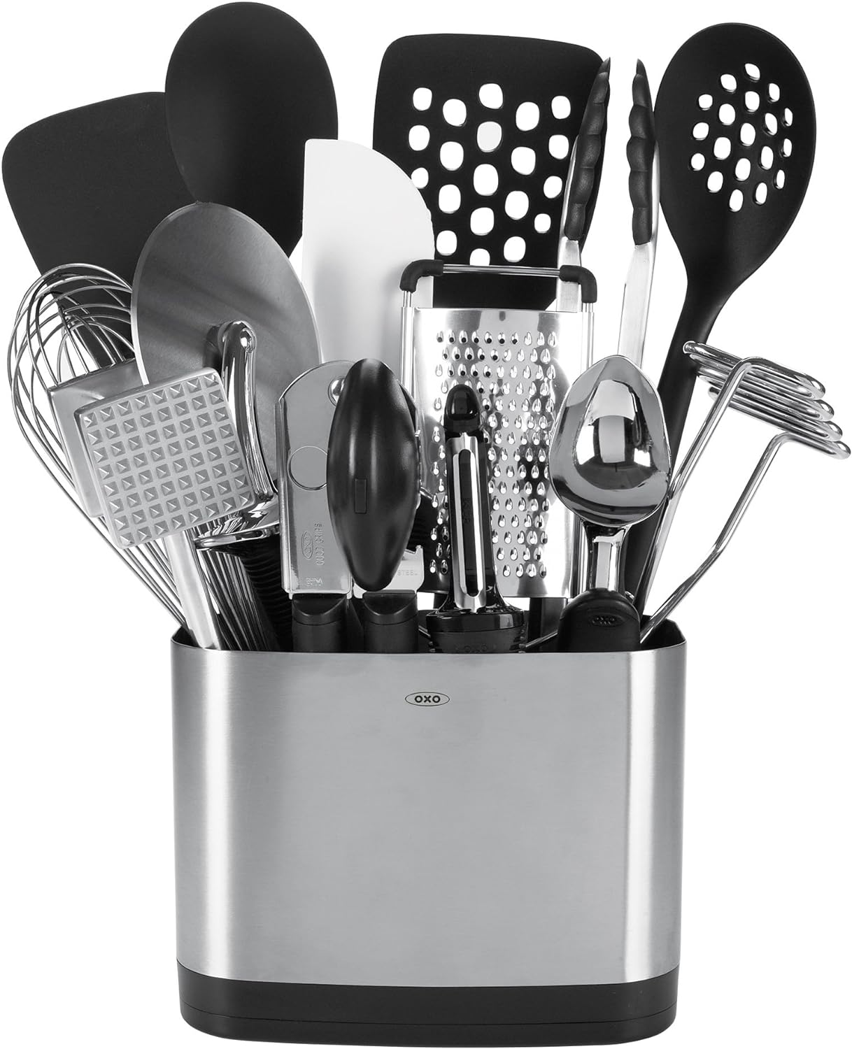 Slim-lined, space-efficient utensil holder with 14 of OXO’s most important everyday kitchen tools