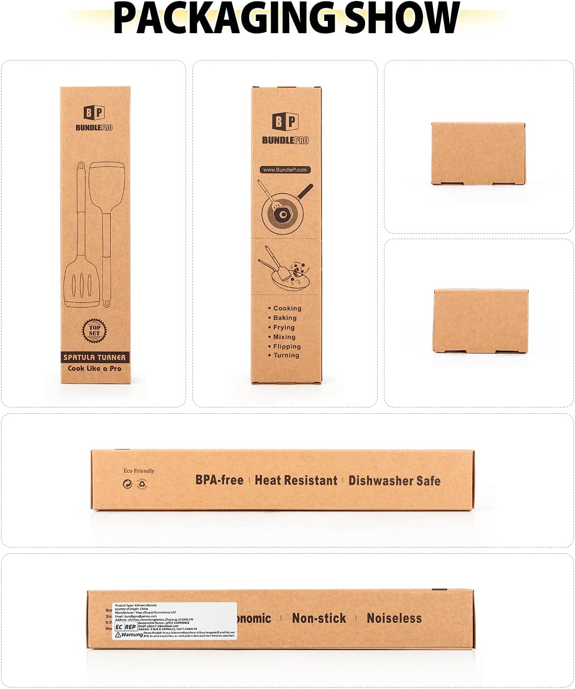 JUST WANT TO PROVIDE THE BEST FOY YOU : Life comes from details. Bundlepro Kitchenware insists on controlling the details. The modern black color can be freely matched with different kitchen styles. The soft food-grade silicone is designed for noise-free cooking. Thin and flexible edge,is ideal for flipping.
