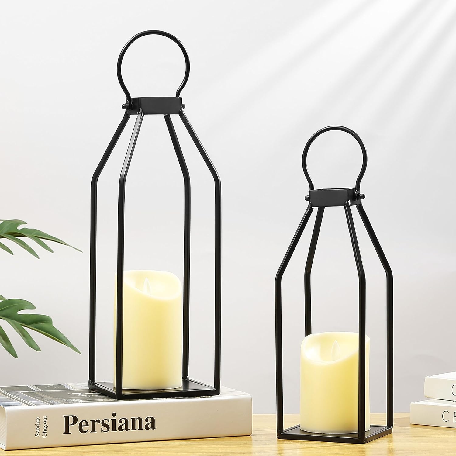 Perfnique Modern Farmhouse Lantern Decor, 15” 13” Set of 2 Black Metal Lanterns, 2 LED 6hr Timer Flickering Flameless Candles, Lanterns Decorative for Outdoor Decor, Home, Indoor, Patio