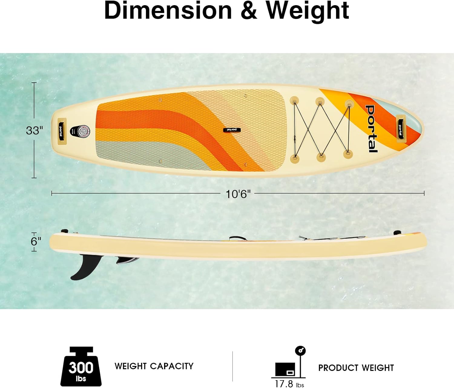🏄 【COMPLETE SUP ACCESSORIES】— The set up size is 10′ 6″x 33″ x 6″ and the weight is 17.8 pounds, weight capacity suggested: 300lbs. Package includes: inflatable paddle board, carry backpack, ankle safety leash, hand pump, repair kit & user manual, detachable fin, adjustable paddle, waterproof phone bag