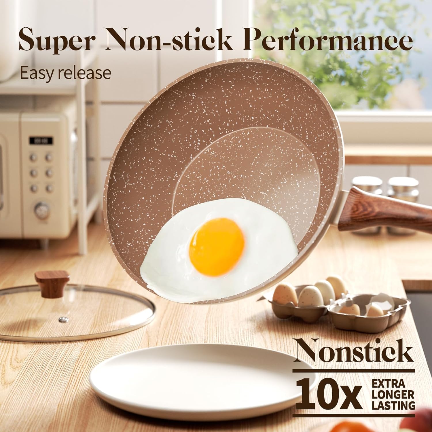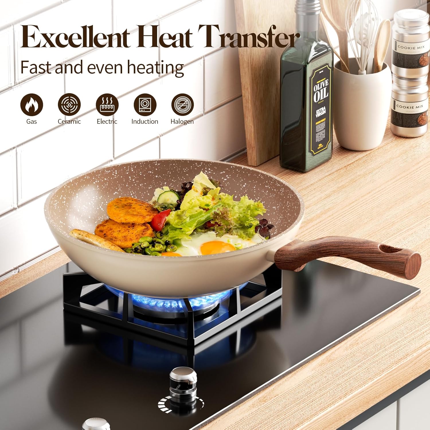 【Non-Stick Coating】 Non-stick granite coating prevents food from sticking well. Non-toxic and 100% PFOS and PFOA free, ensuring your daily cooking is always safer and healthier. Using less oil can reduce unnecessary fat intake and keep you away from a smoky kitchen