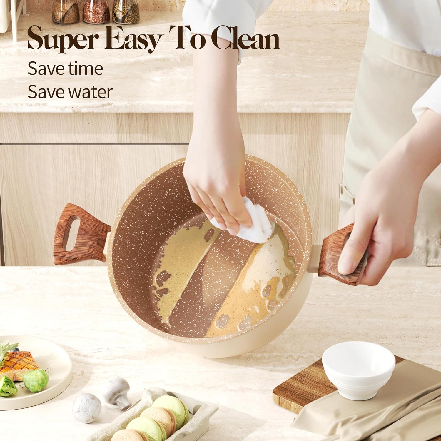 【Easy To Clean】 Simply wipe with a paper towel or rinse with water, making cooking not only easier but also more enjoyable. Hand washing is recommended to better protect the internal coating and extend the life of the non toxic cookware set