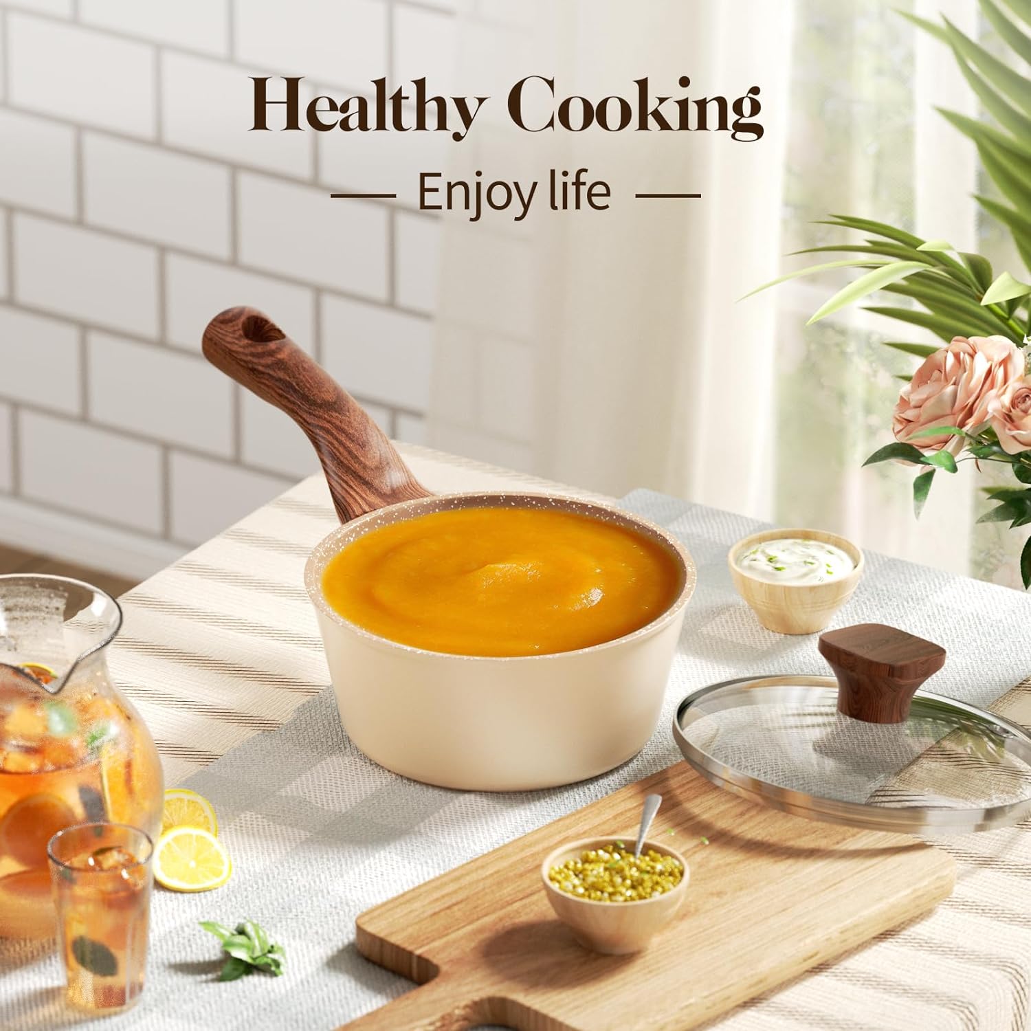 【Non-Stick Cookware Set with Bakelite Handle】 The handle of pots and pans is designed with the best ergonomics to give us a convenient grip. Bakelite is heat-resistant and keeps us cool during cooking for maximum comfort. The double rivets are securely fastened to the body of the pan and will not come loose for a lifetime