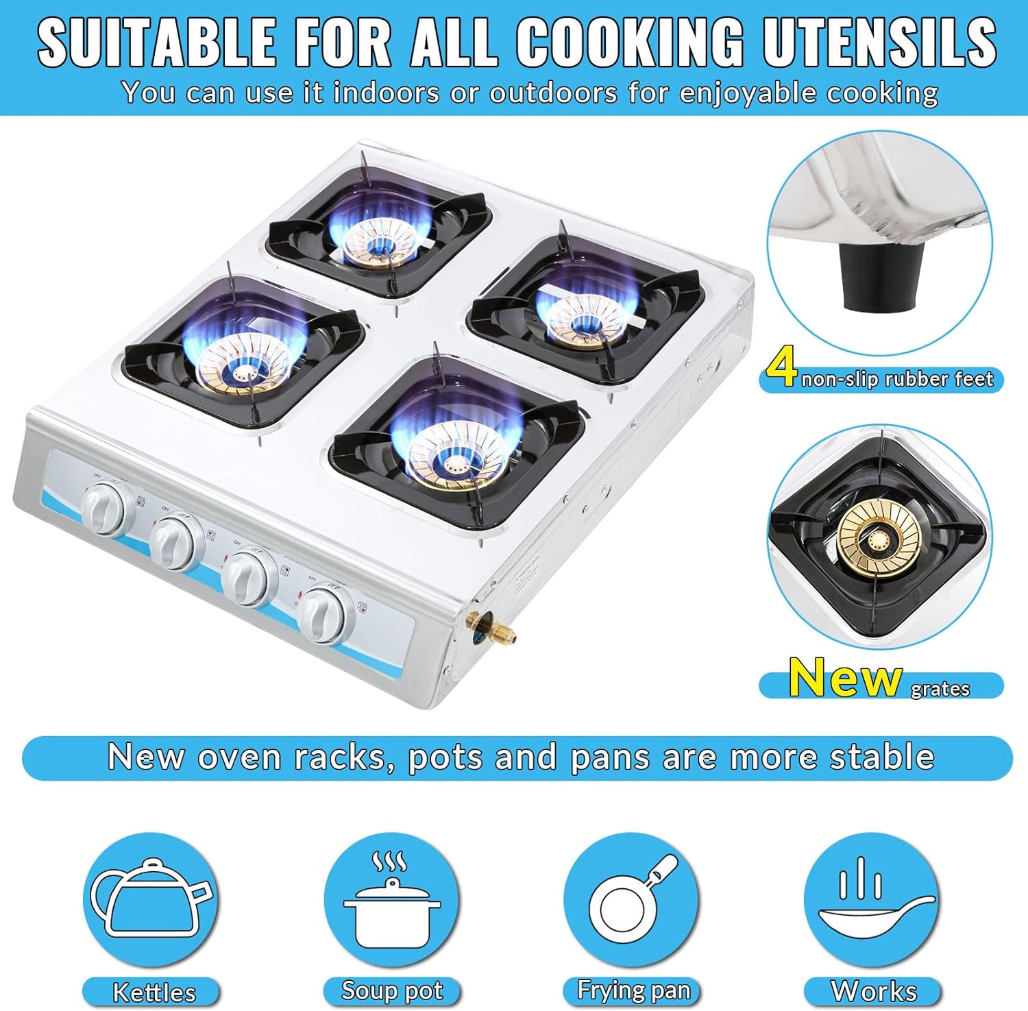 【Perfect Dimension】- This gas cooktop measures: 22.2″ x 18.5″ x 3.5″ Propane stove , wok and pan can be stably placed , non-slip gas burner with four non-slip rubber legs.