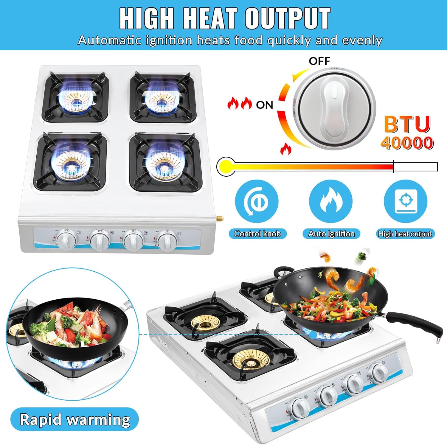 【High Heat Output】-Portable Gas Stove Powered 40,000 BTU/hr,Heats up Food Quickly and Evenly with Auto Ignition, no Need for Cumbersome Start-up and Heats up Quickly Features a Control Knob to Conveniently Set.