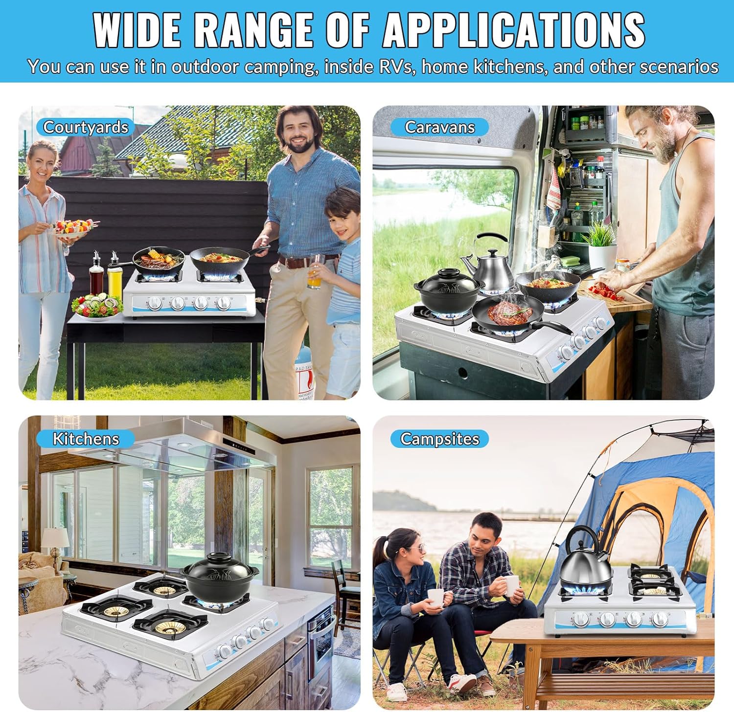 【Maerial】-The surface of the propane gas cooktop is durable and made of 304 stainless steel, which is corrosion-resistant and easy to clean.