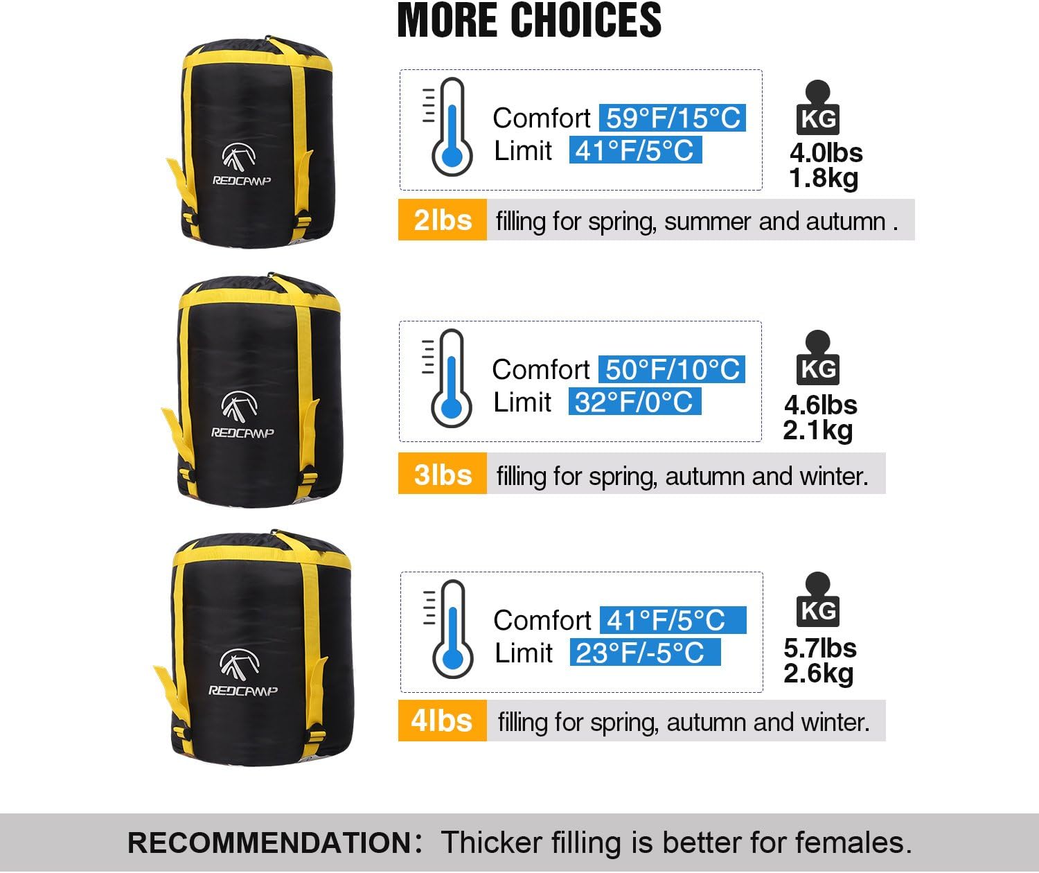 Temperature Range: 2lbs filling 80% cotton lined adult sleeping bag is comfort in 59°F/15°C and fits temperature range 50-77°F/10 – 25°C.3lbs filling sleeping bags is comfort in 50°F/10°C and fits temperature range 41-68°F/5-20 °C. 4lbs filling sleeping bags is comfort in 41°F/5°C, and fits temperature range in 32-59°F/0 – 15°C. Females are recommended to choose the thicker sleeping bags.