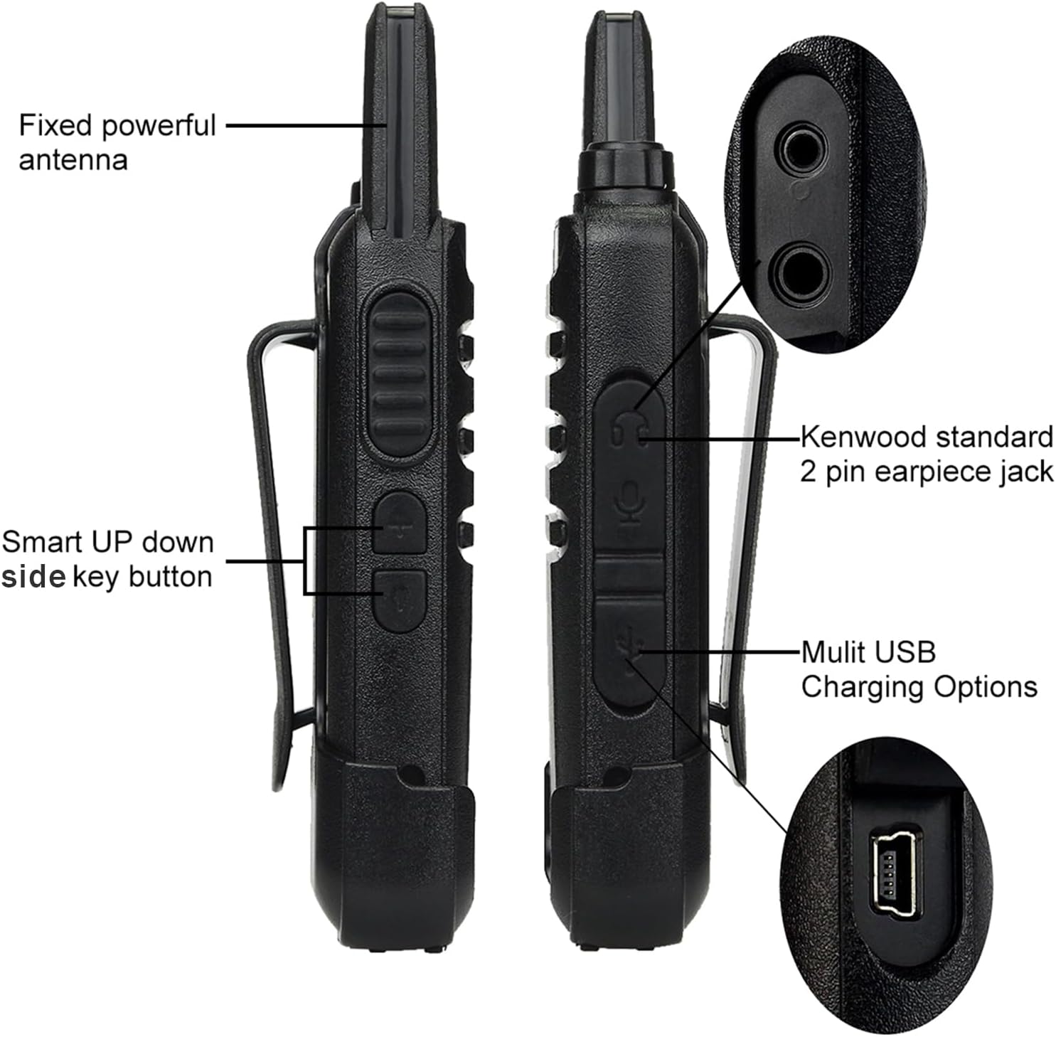 Increased durability; Anti-fall ABS material; integrated large back clip increases stability; fixed short antenna reduces damage caused by falling