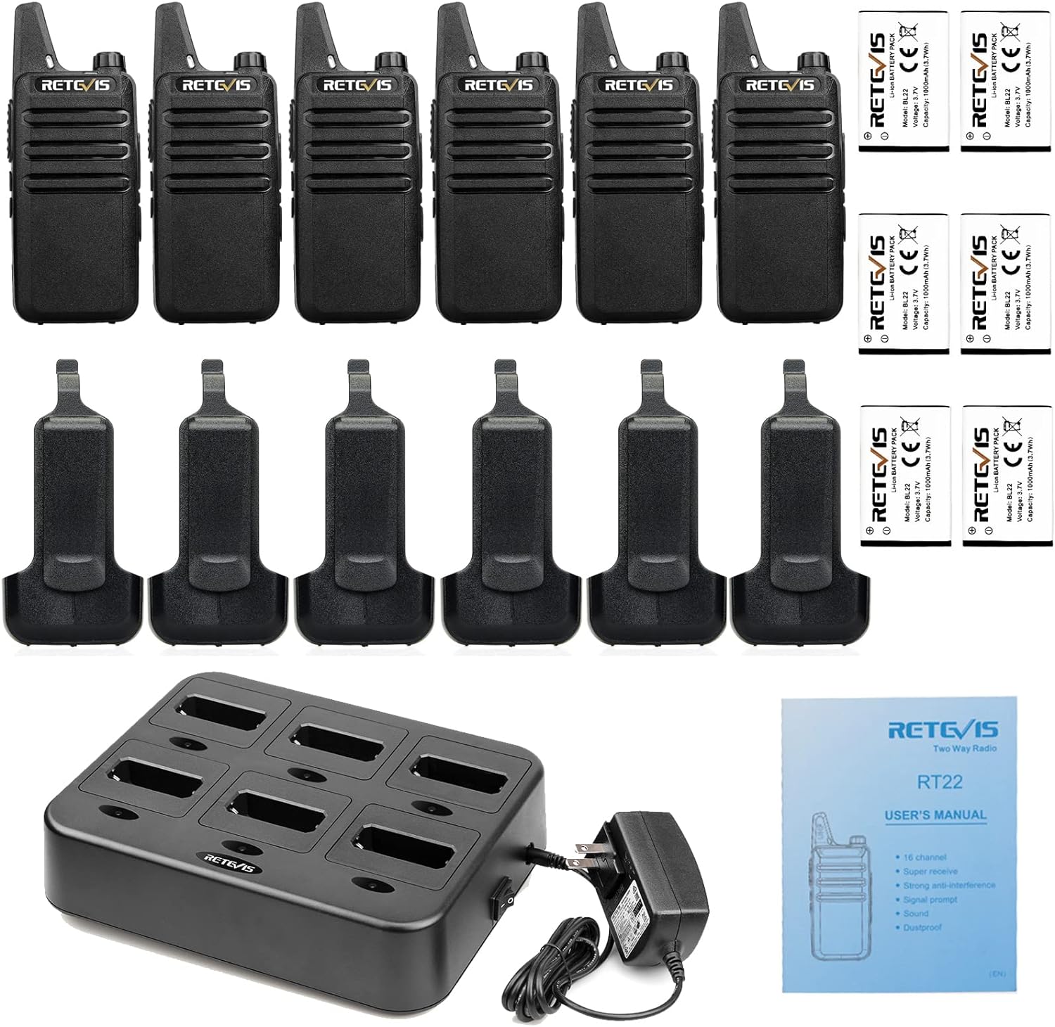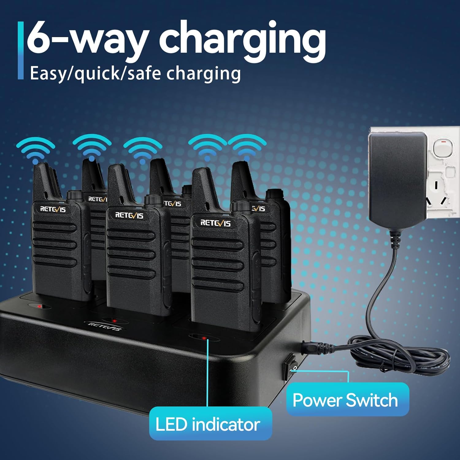 Includes six way multi gang charger; with multiple charging protections; overcharge; over voltage and short circuit protection; more safer for charging the 6 pack 2 way radios at the same time