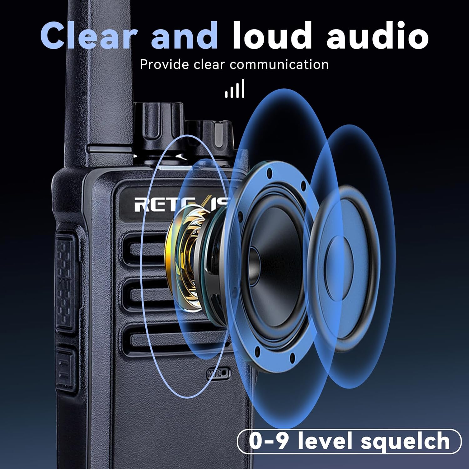 0-9 level squelch (default level 5), allows you to clearly receive and transmit voices in noisy environments.