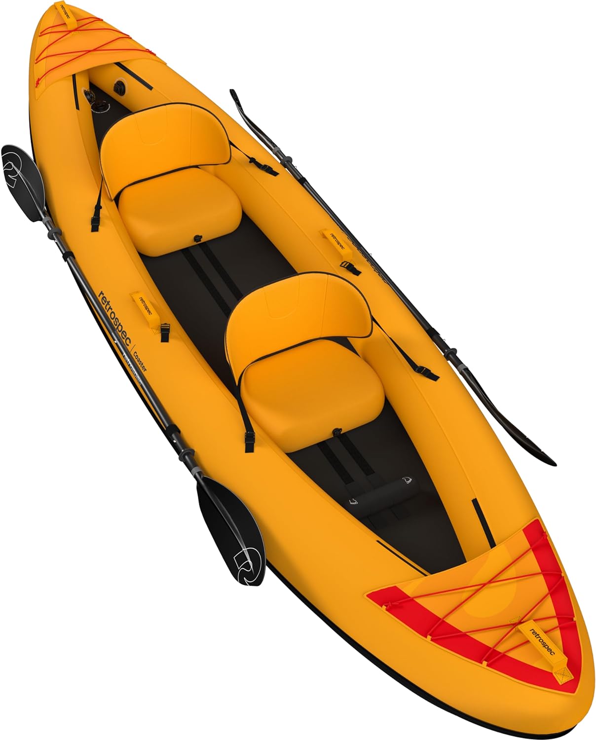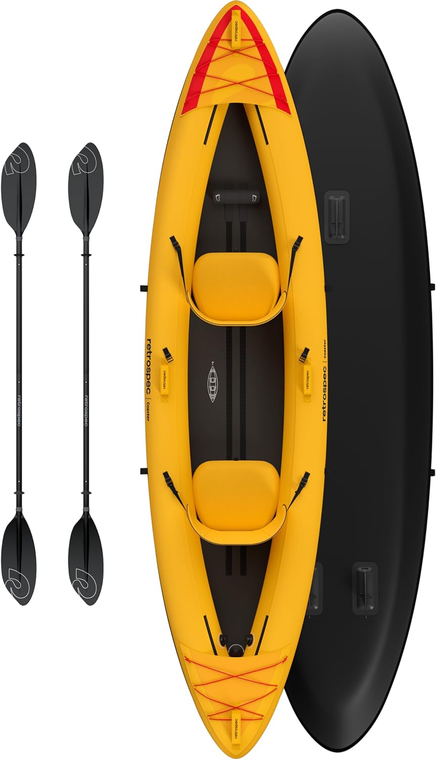 IMPRESSIVE DURABILITY – Don’t let the air-filled design fool you; this blow up kayak is lightweight yet incredibly durable! The Coaster two person kayak is solid and made to last, with robust 900-Denier puncture-resistant polyester fabric and a heavy-duty Tarpaulin hull. With a maximum weight capacity of an impressive 505 lbs, it offers exceptional durability and stability for all your adventures on the water.
