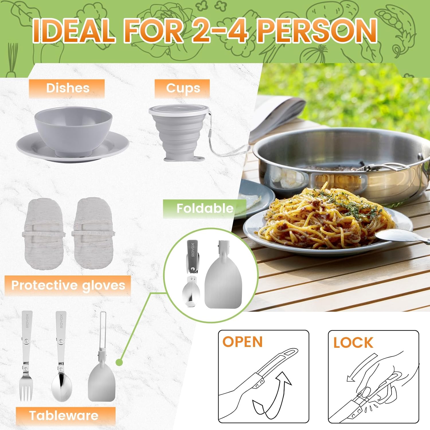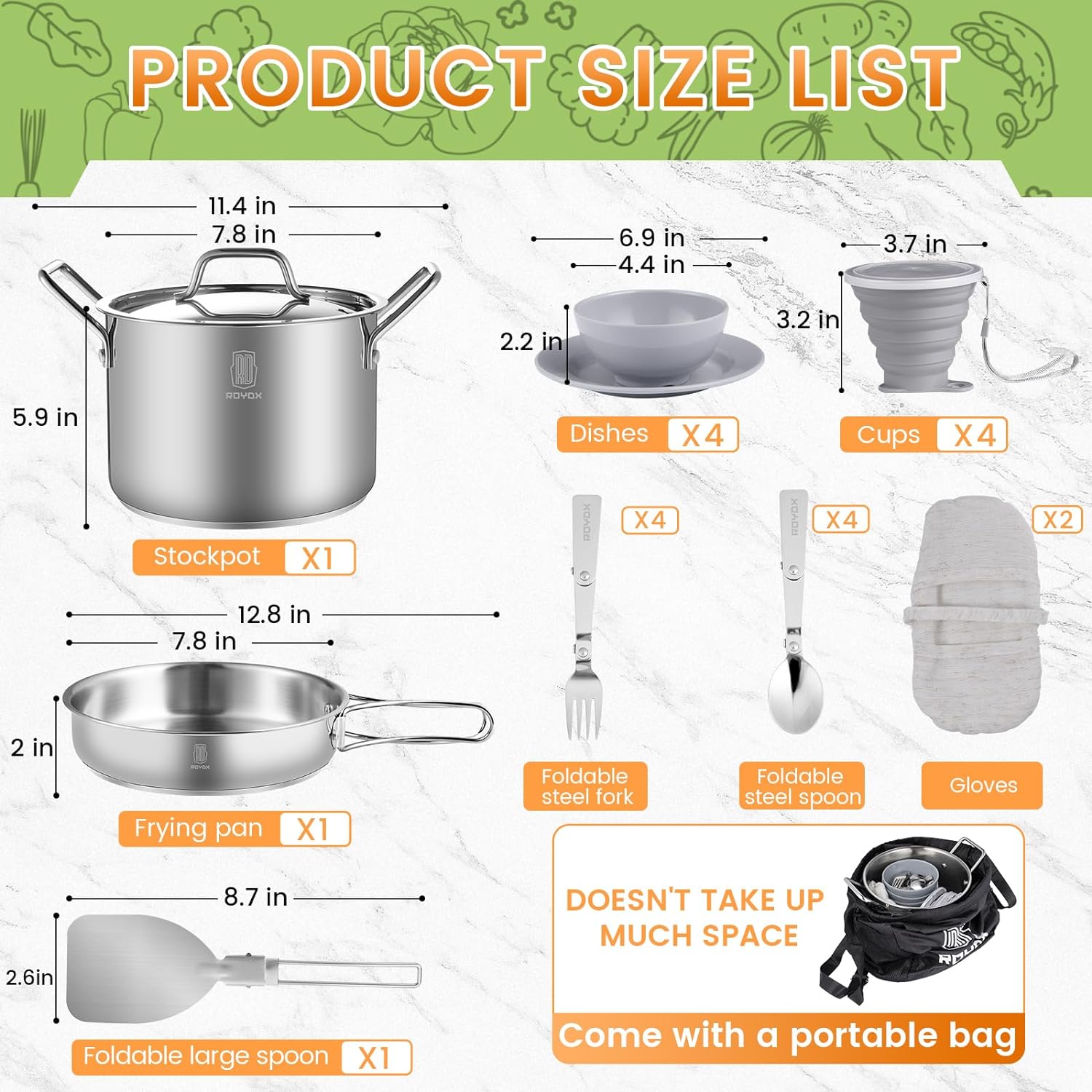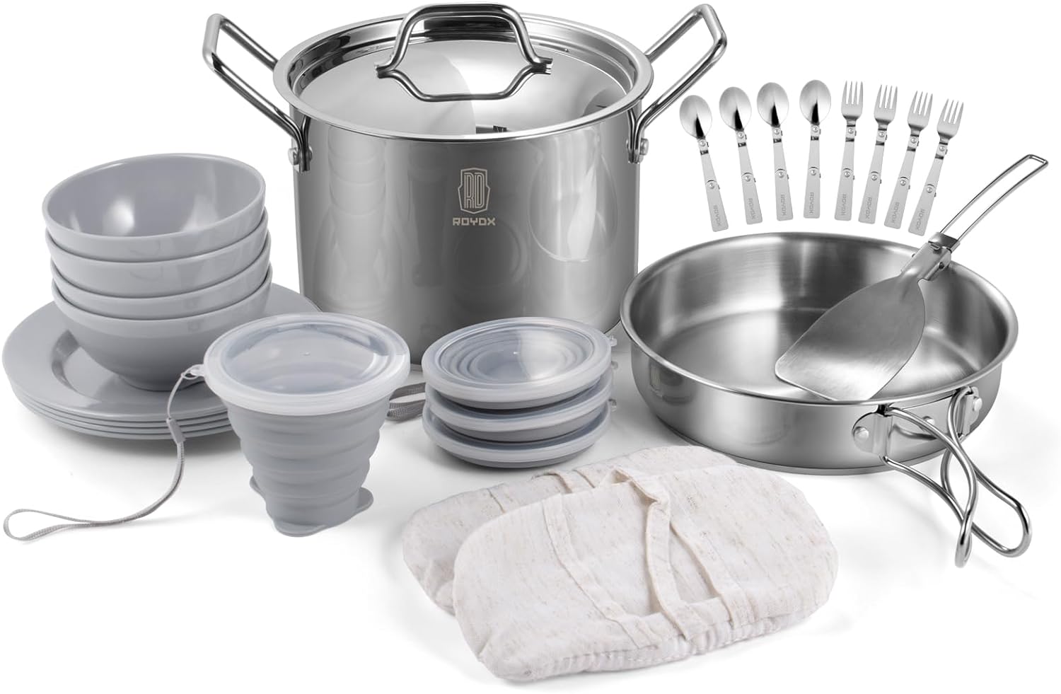 ♨ Set Includes:8inch foldable handle frying pan & 4 QT stockpot with lid,one set of protect gloves;2 cutlery set with a fork, spoon;4 bowls and 4 plates for enjoy delicious food ,4 PCS of foldable food grade silicone cups,and a large spoon to tumble the food in the pan,1 portable bag for easy storage.