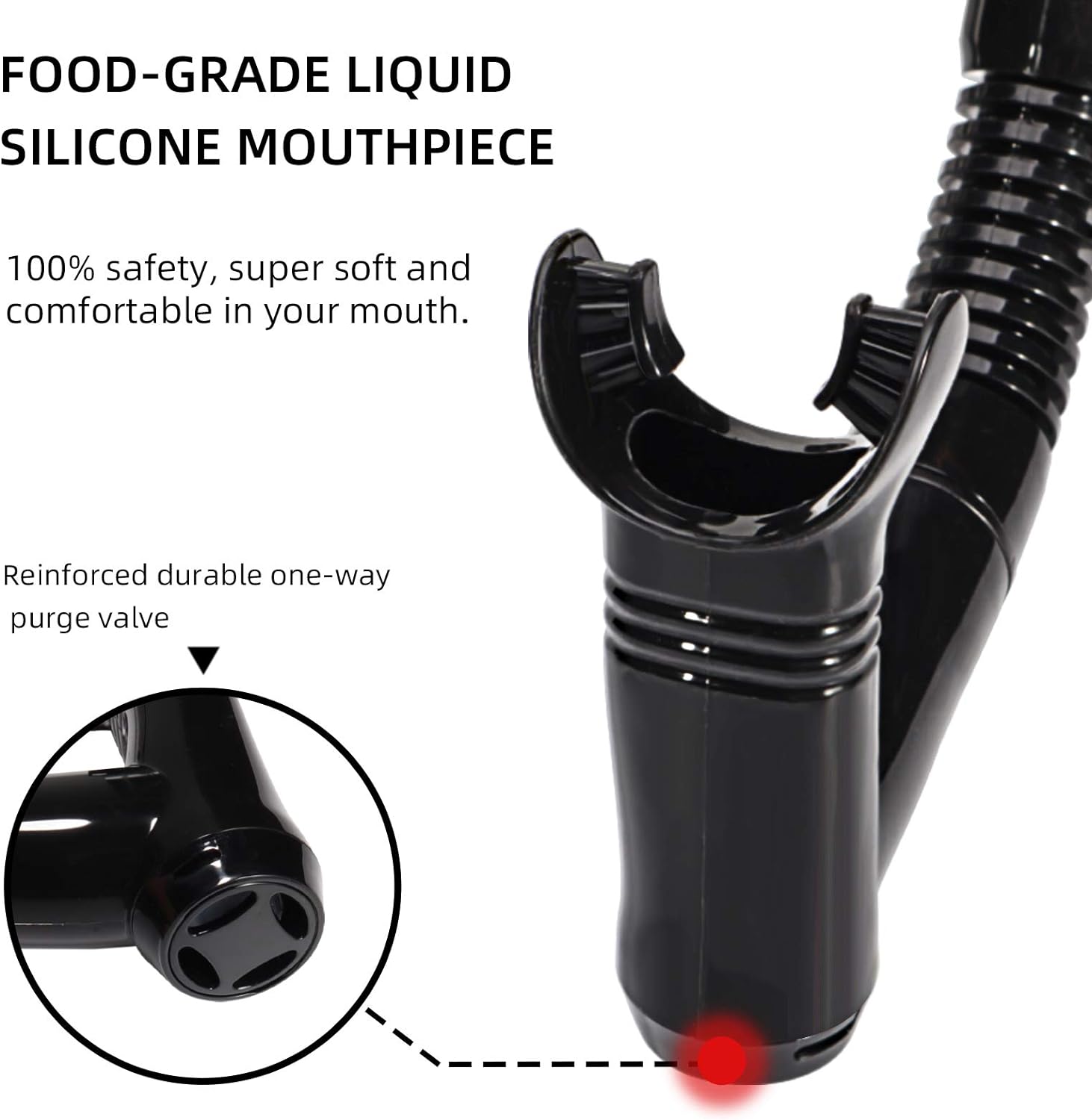 🏊♀️Food-grade Mouthpiece & Optimized One-Way Purge Valve-Super soft and safe material for the mouthpiece, very comfortable in your mouth and provides a good seal. form-fitting with angled and corrugated mouthpiece design, allowing for prolonged use. The purge valve has professional protective parts and is not easy to lose and shake.