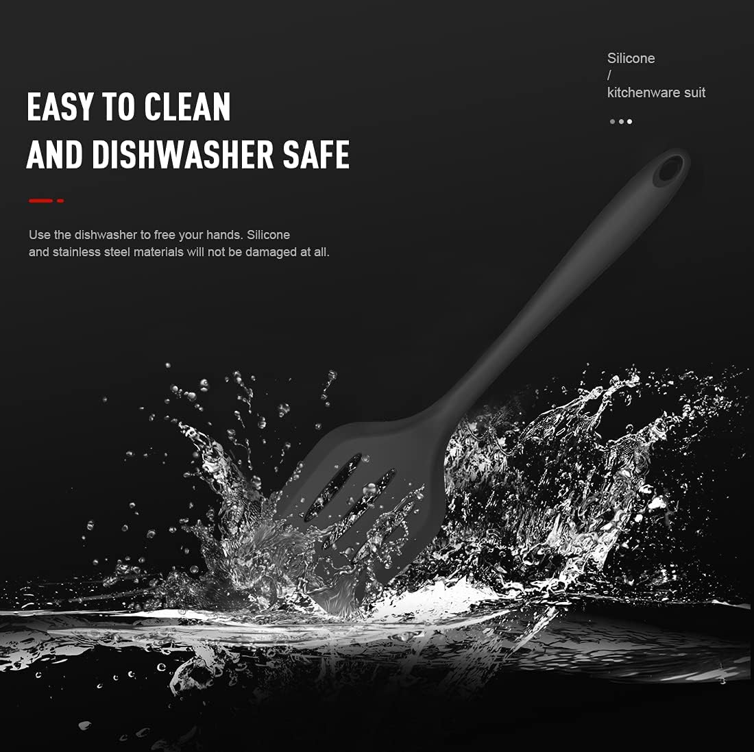 The cooking utensils One- piece stainless steel core to enhance durability and toughness to keep the spatulas from bending or deformation. This means you completely leave the cleaning to the dishwasher, which is the perfect base kit for new home cooking utensil sets