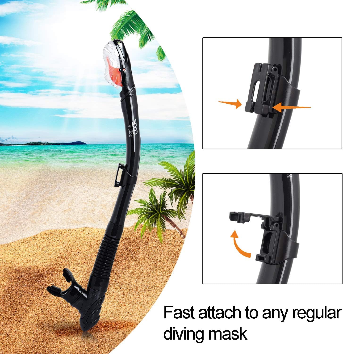 【Unobstructed Breathing Dry Top Snorkel】 Ahigh-quality snorkel with a dry-top valve that seals the breathing tube when submerged. dry top snorkel is designed to keep water from entering the breathing tube, ergonomic silicone mouthpiece is comfortable and durable. Lower purge valve allows water to be quickly expelled, so you can enjoy easy and unobstructed breathing while diving underwater.