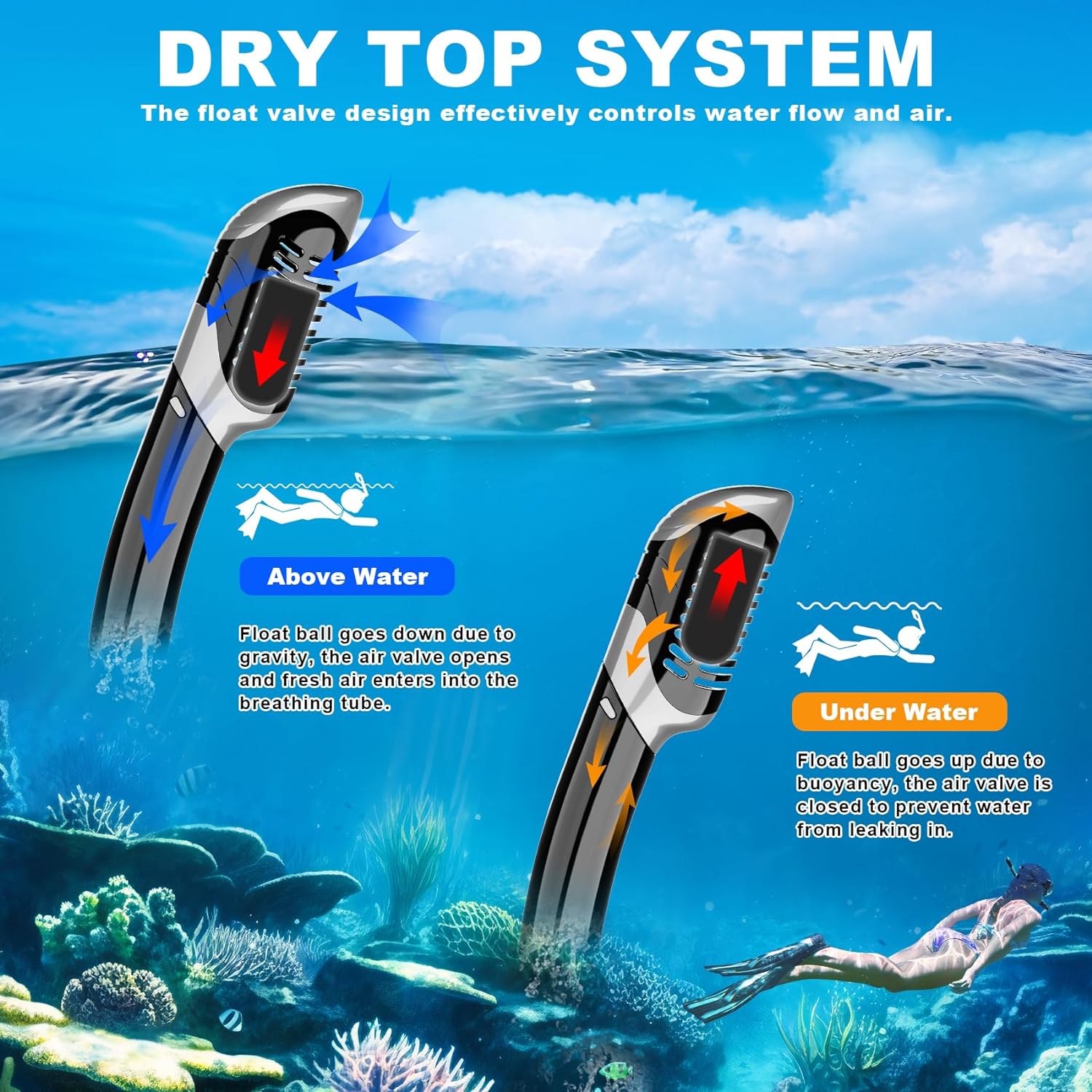 Dry Top No Leaking Scuba Mask: Adopting a float valve at the top of the breathing tube, the snorkel can completely seal it to keep water out when underwater and would open to let you breathe easily when above water. The lower one-way purge valve can quickly drain the water leaking into the snorkel, making the snorkeling effortless.