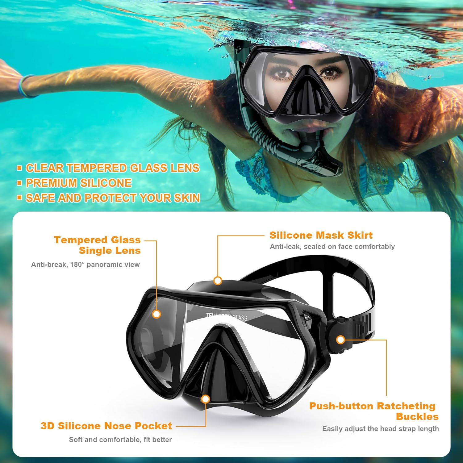 Adjustable Comfortable Head Mask Strap: Made of soft food-grade liquid silicone, the skirt of the swim mask will not cause pressure on the face. The side adjustment mask strap buckle is convenient, gently press to adjust the length of the mask strap for different head shapes, so that it conforms to their face and prevents water from getting into their eyes.