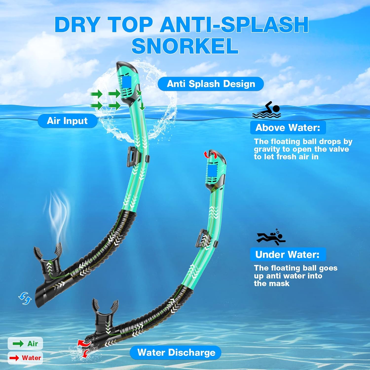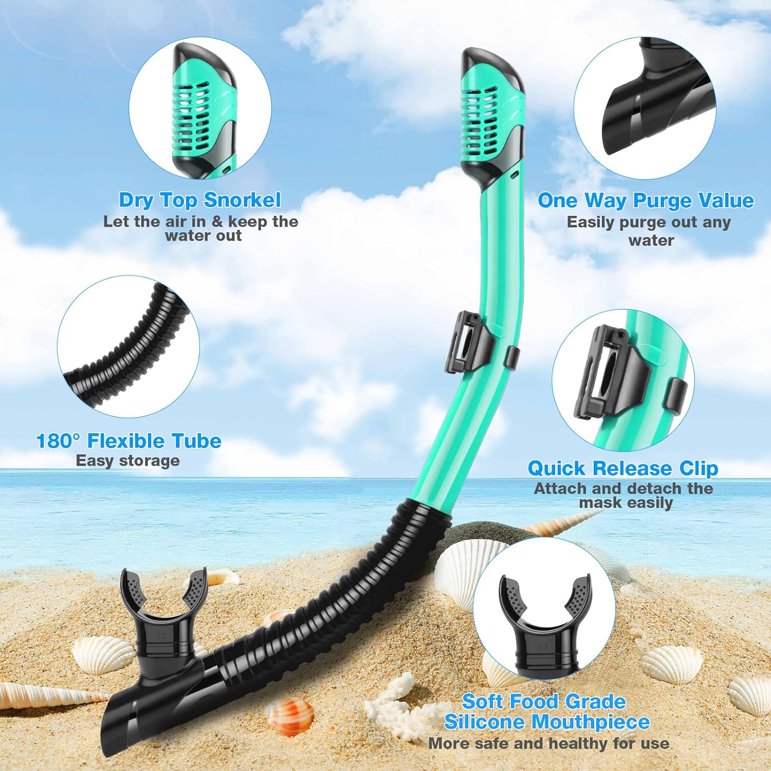 🏊♀️【 Dry Snorkel with One Way Valve 】 Our dry snorkel adopting float valve at the top of breathing tube. the float valve closes to keep water out of the snorkel when you dive and would opens to let you breath easily when above water. One-way purge valve help to clear out water leak into snorkel by quick blow through the mouthpiece. PIYAZI adult snorkel is a nice touch if you are in rougher water or are constantly diving during snorkeling.