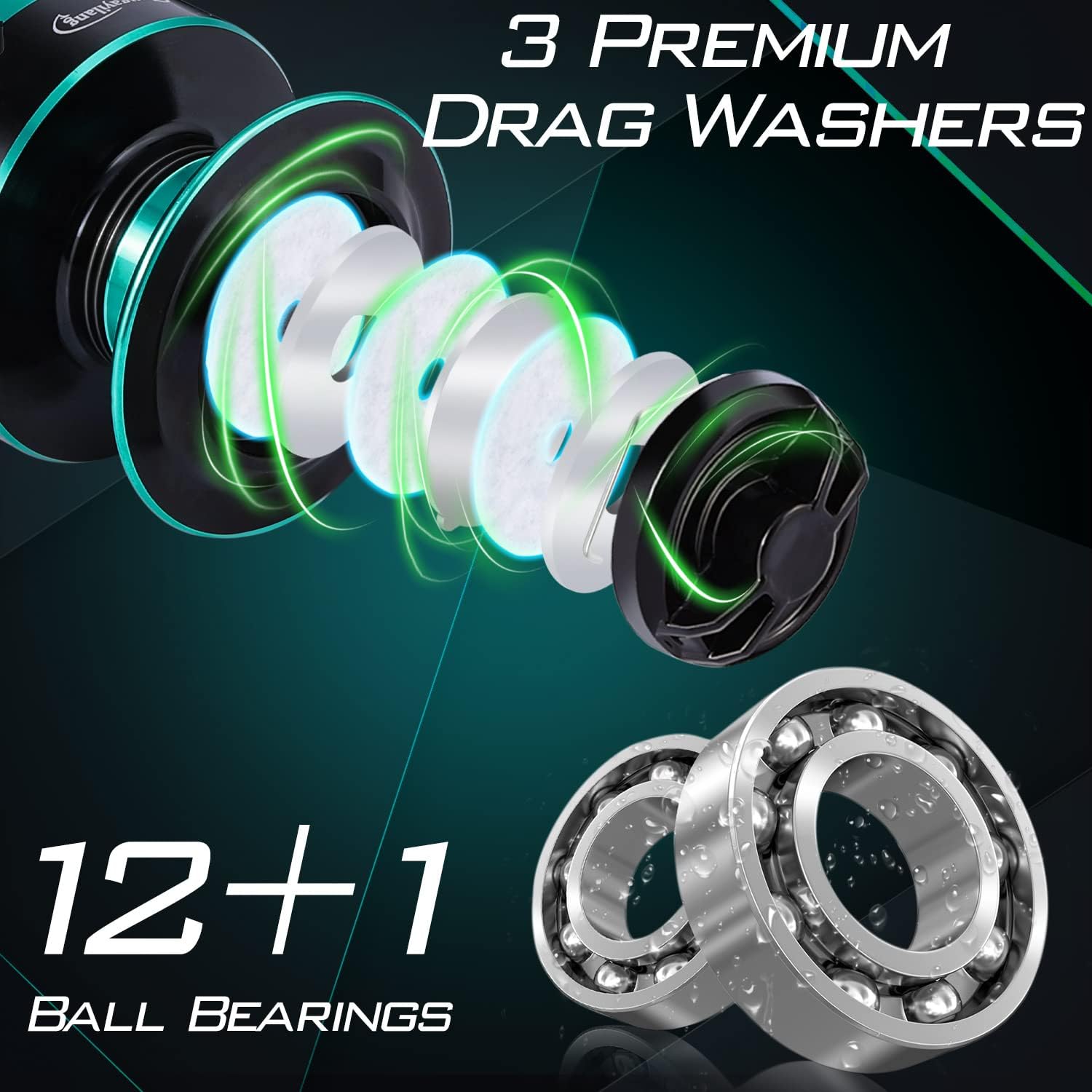 Reel – The fishing reel adopts with the large ball handle knob which is more comfortable and powerful than the normal types.The reel is equipped with 12+1 ball bearings and rear drag functions, precision gears with a 5.0:1 ratio, which provide durability and strength, bring you a more pleasant experience of fishing.