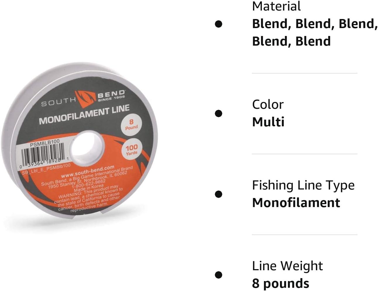 SouthBend PSM8LB100 Country Of Origin: China Item Package Dimensions: 1.016 L X 6.35 W X 6.35 H (Cm) Item Package Weight: 0.022 kgs Product Type: Fishing Line